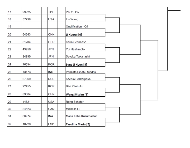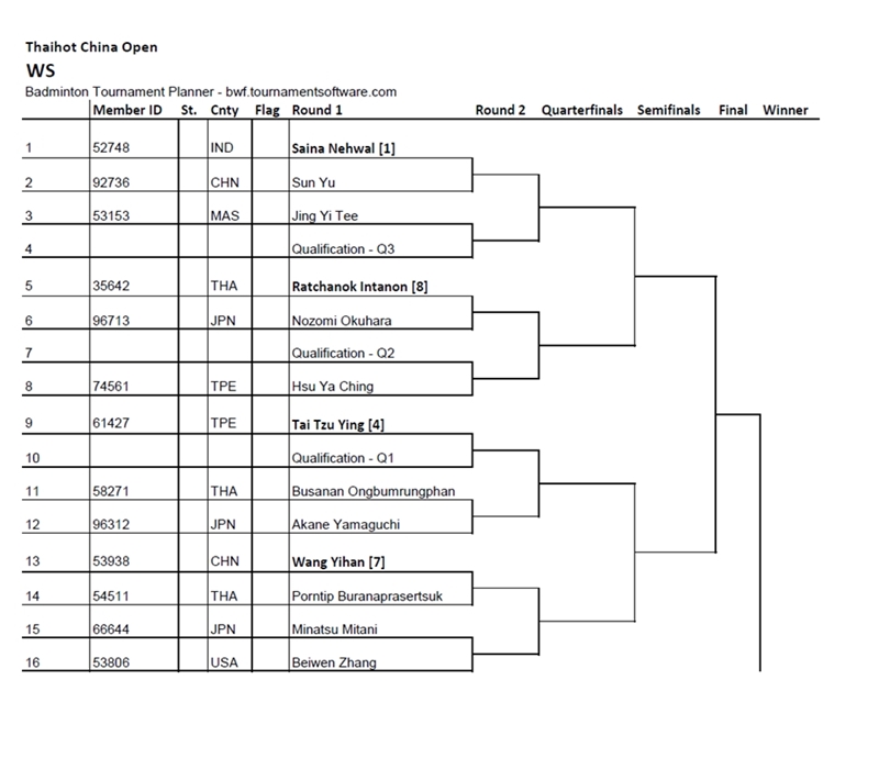 ผลจับสลากแบ่งสาย THAIHOT CHINA OPEN Superseries Premier 2016 (15 - 20 NOVEMBER)