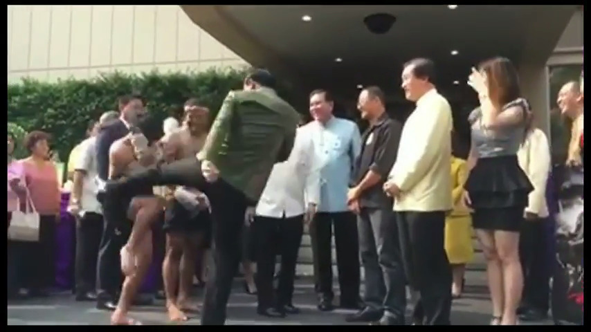 ดูแล้วเหมือนนักมวยจะยกแข้งบังได้ แต่ความจริง ท่านนายกเตะผ่านการ์ดเข้าไปที่ลำตัวเต็มๆครับ เพียงแค่เตะเบาๆ และดูเหมือนในรูปข้างบน ท่านนายกจะไม่ได้คว่ำสะโพก แต่ผมได้เห็นรูปที่โชว์ว่า ท่านคว่ำสะโพกนะครับ ดูรูปข้างล่าง ทีแข้งทะลุการ์ดไปแล้ว ปลายเท้าท่านนายกเริ่มจะบิดลงแล้วนิดหน่อย และดูการทิ้งแขนซ้าย ข้างเดียวกับขาซ้ายที่เตะ ไปทางด้านหลัง นี่คือการเตะที่ถูกต้องครับ การทรงตัวจะสมดุลย์ และหากต้องการ แรงเตะจะหนักหน่วง กว่าการยกแขนขึ้นบังครับ และขอวิจารณ์นักมวยไชยาด้วยครับ ผมเคยได้ยินว่านักมวยไชยาจะรับแข้งด้วยมือ คราวนี้ใช้ยกแข้งบังแทน คงไม่ค่อยชิน แข้งท่านนายกเลยทะลุเข้าไป นักมวยควรอ้าแข้งออกไปรับ ให้สันแข้งปะทะกับแข้งฝ่ายเตะ ที่มุม90องศาครับ ไม่อย่างนั้น จะโดนสันแข้ง เข้าที่ด้านข้าง ซึ่งจะเจ็บกว่า อีกประการคือ การยกแข้งรับเตะ ต้องให้แขนที่ยกขึ้นบัง บังโดยศอกอยู่ในตำแหน่งที่พาดลงต่ำเลยต้นขา จนบังเป้าได้หมดครับ แต่นี่ยกแขนบังสูง แข้งท่านนายกเลยทะลุเข้าเป้า