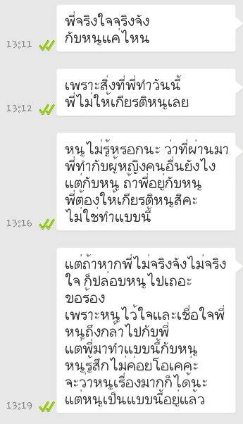 สักพักเขาก็กล้มมาหอมเราทีนึงเราก็ขัดขืนเหมือนเดิม แล้วพูดขึ้นว่า "พี่ให้เกียรติหนูหน่อยสิ" เขาเลยปล่อย