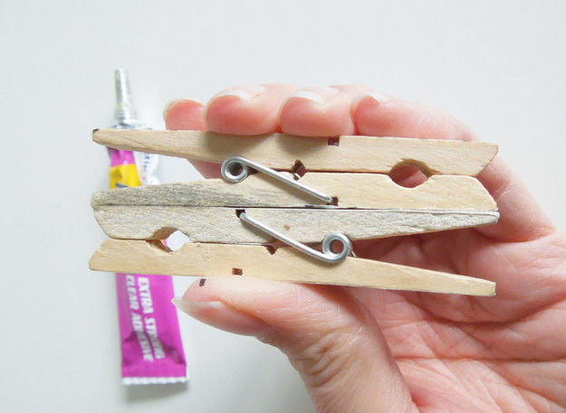 3.เอาไม้หนีบผ้าทั้งสองประกบติดกันด้วยกาว อย่าลืมเอาหัวกับท้ายของไม้หนีบสลับกันนะค่ะดังรูป