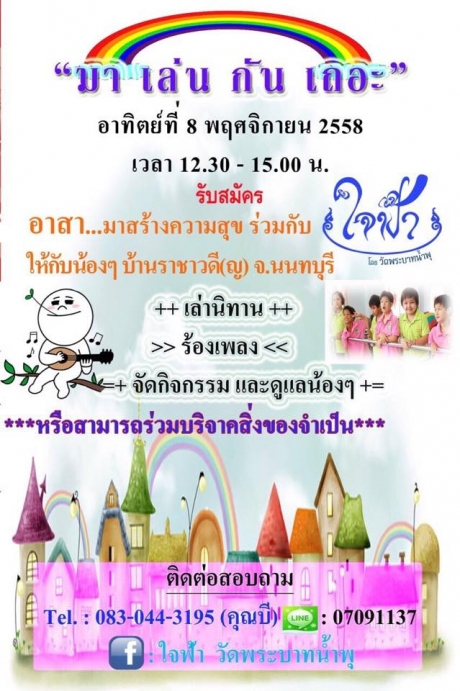 ต้องการจิตอาสาจำนวนมาก ขอแรงใจ แรงกาย มาช่วยสร้างความสุข กิจกรรมสันทนาการ เล่านิทาน ปรบมือ คุยเล่นกับน้องสร้างความบันเทิงใจหรือเล่นดนตรีให้น้องเต้น