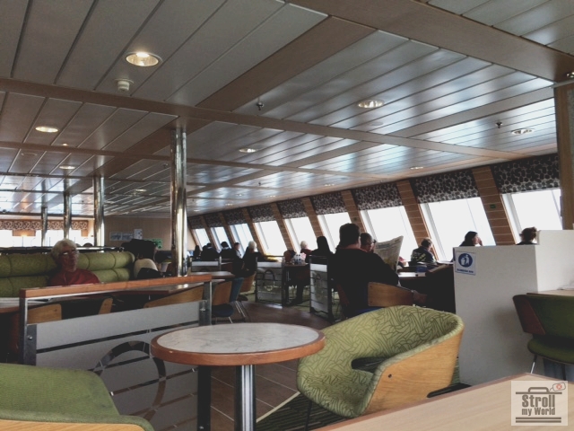 เมื่อถึงเวลา ก็ทยอยกันขึ้นเรือ บนเรือมีหลายชั้น โดยปกติเราจะนั่งอยู่บริเวณ โถงกลาง บางชั้นมี ทีวี ร้านอาหาร ที่นั่งรับประทานอาหาร เราเลยยึดด้านข้างหน้าต่างไว้ก่อน ใช้เวลาเดินทาง 2 ชม