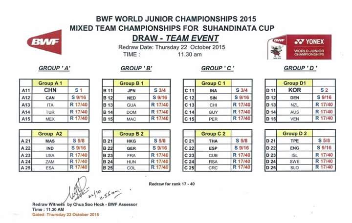 สายรอบแบ่งกลุ่ม Mix team World junior 2016 for suhandinata cup มาแล้วครับ