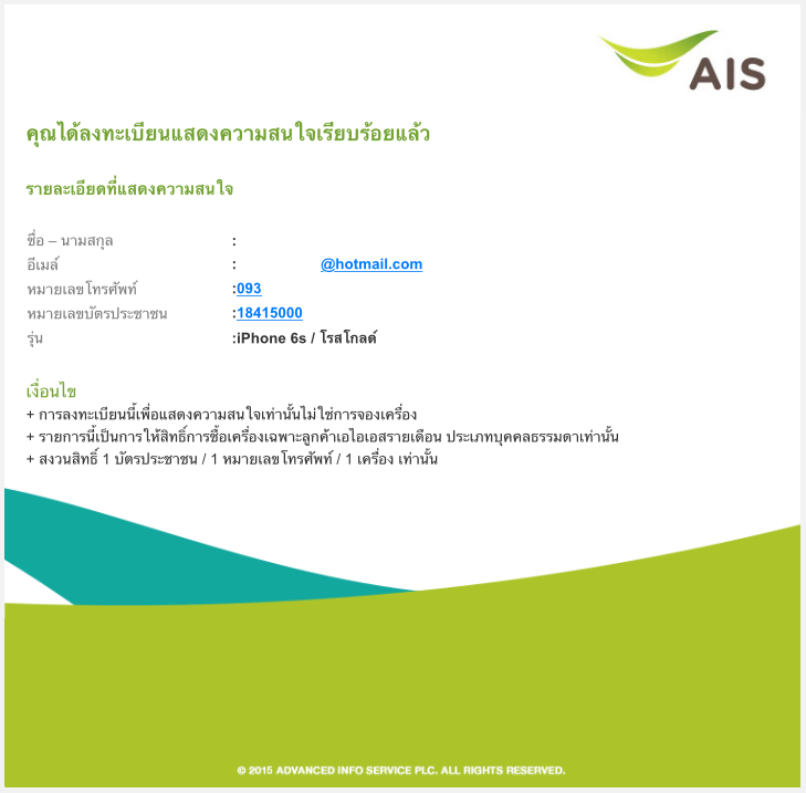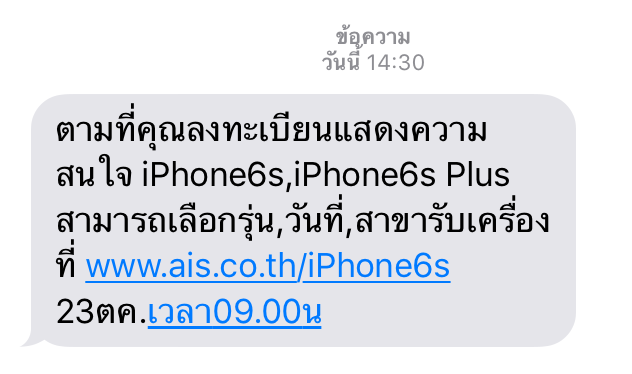 ว่าได้รับสิทธิ์ในการจองเครื่อง iPhone 6s และ iPhone 6s Plus กับทาง AIS