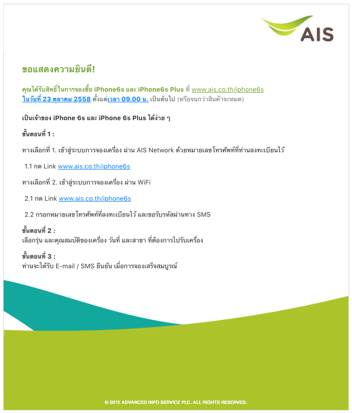 รายละเอียดสำหรับผู้ที่ได้รับสิทธิ์ในการจอง iPhone 6s และ iPhone 6s Plus จาก AIS