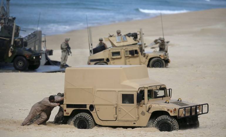 นาวิกโยธินอเมริกันช่วยกันเข็นรถที่ล้อติดทราย ระหว่างร่วมซ้อมรบครั้งใหญ่สุดในรอบกว่า 10 ปีของนาโต