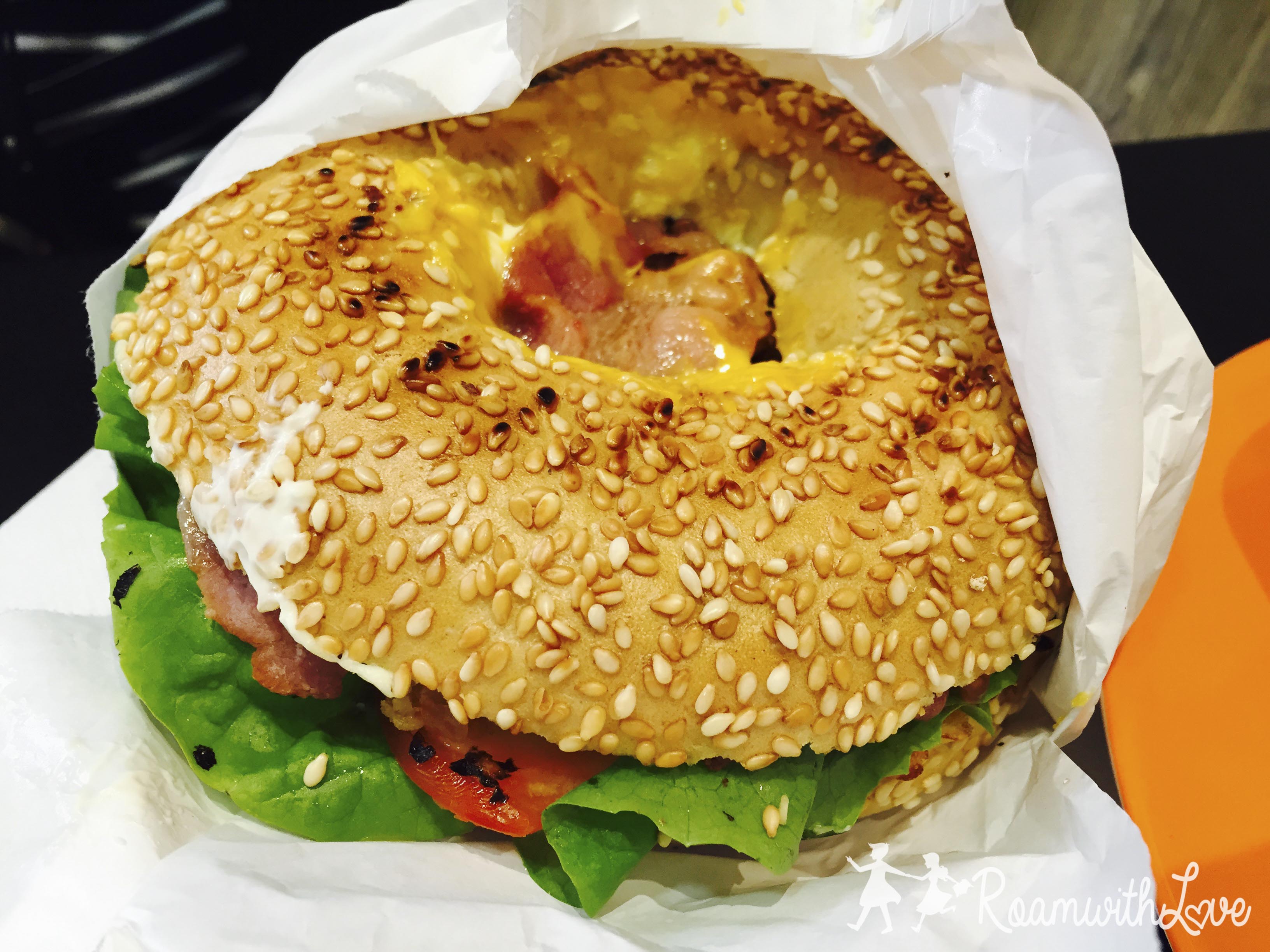 ของคุณสามีเป็น New York Bagel เป็น Bagel เนื้อ กับเบคอน และ ผักสด เราขอแย่งไปกินหนึ่งคำ เพราะกลัวอ้วน (เพราะเป็นแป้ง) ปรากฏว่า...อร่อยมากกกก ขออีก 3 คำ (ลืมเรื่องอ้วนไปเลย)