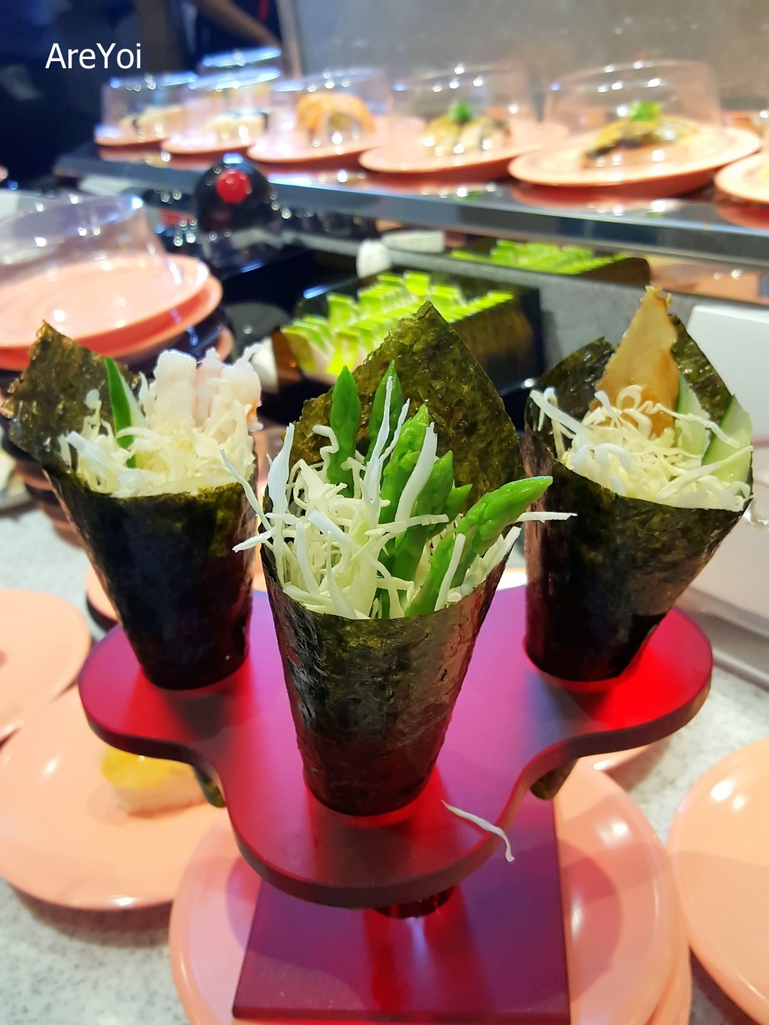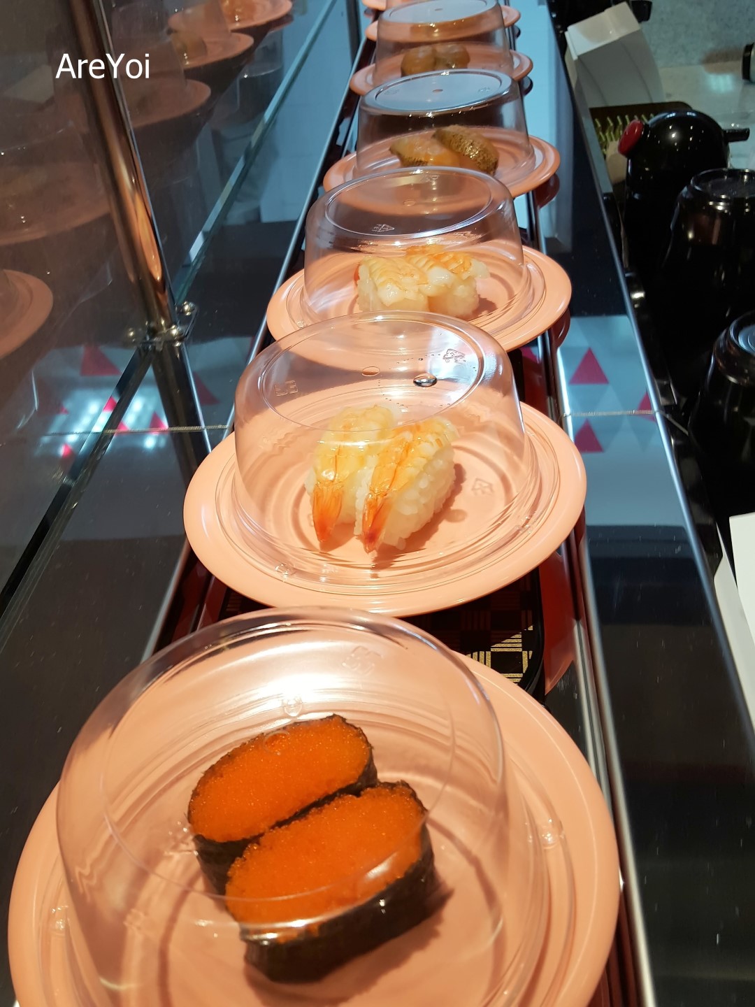 วิธีกินก็คือหยิบซูชิที่ไหลมาตามสายพาน อยากกินอะไรก็หยิบครับ