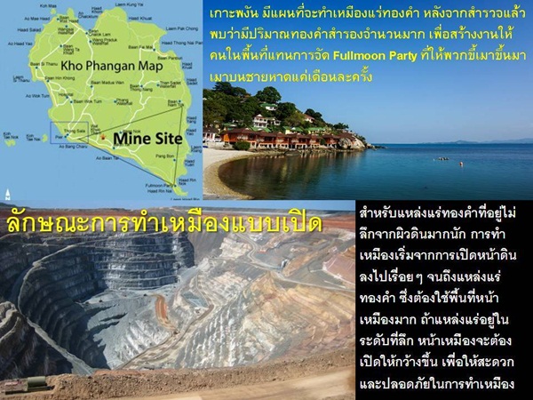 “เกาะพะงัน” เวลานี้มีการวางแผนทำเหมืองทองขนาดใหญ่ การทำเหมืองแร่จะนำมาซึ่งการจ้างงานสำหรับคนในท้องถิ่น เป็นการทำอุตสาหกรรมที่ดี เพื่อสุขภาพที่ดี ย่อมดีกว่าการกินเหล้าบนเกาะ และให้เด็กขี้เมาขึ้นมากินเหล้าบนชายหาดแค่เดือนละครั้ง