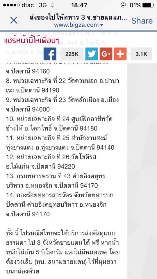ขอความช่วยเหลือร่วมกันส่งสิ่งของเครื่องใช้ต่างๆให้ ทหาร 3 จังหวัดหน่อยค่ะ ร่วมด้วยช่วยกันนะคะ เพื่อช่วยรั้วของชาติ ไม่ต้องมากมาย แค่คนละสิ่งของสิ่งก็พอ ขอบคุณนะคะ
