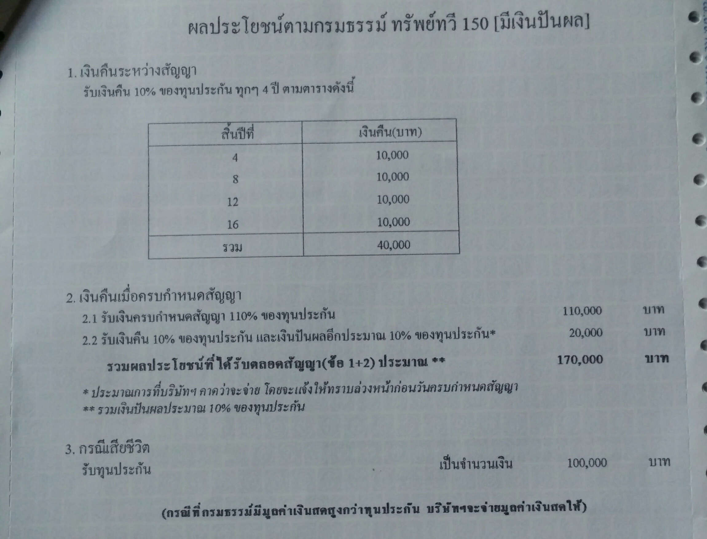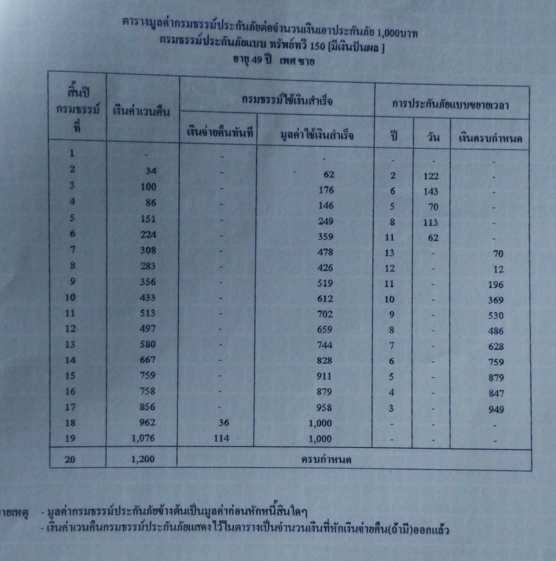ประกันที่ซื้อเป็นของ ไทยประกันชีวิตแบบ ทรัพย์ทวีสิน 150 (มีเงินปันผล) ทุนประกัน 100,000 บาท ส่ง 20/20 ปี รับเงินคืน 10,000 บาททุกสิ้นปีที่ 4,8,12 และ 16 เบี้ยประกันปีละ 8,280 บาท ซึงจะซื้อร่วมกับประกันสุขภาพแนบท้ายอีก รวมๆแล้ว ชำระประมาณ14,000 บาทครับ