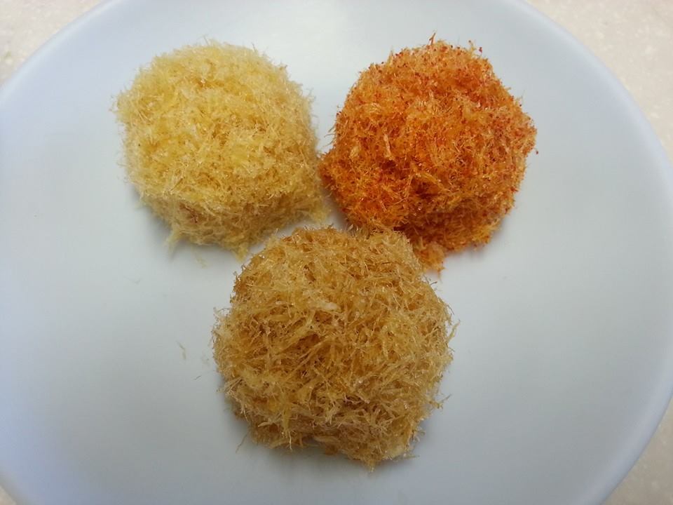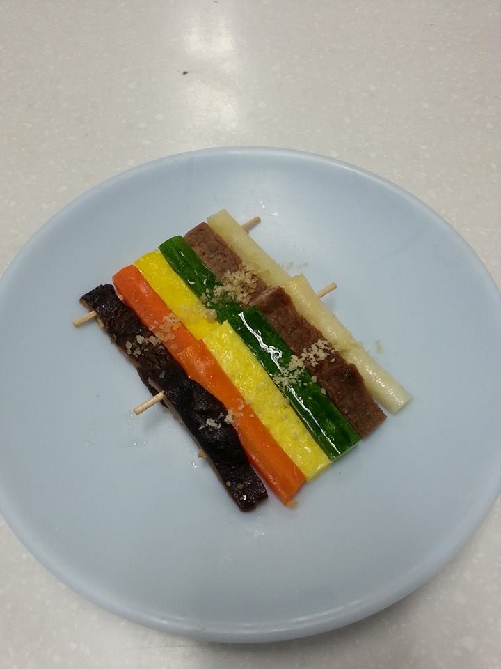 จานนี้เป็นการเอาผักกับเนื้อสัตว์มาหั่นให้ขนาดพอดีคำ ปรุงรสแต่ละชนิด เอามาเสียบไม้แล้วคลุกแป้งชุบไข่ทอด บอกเลยว่าแค่ต้องหั่นแต่ละอย่างให้เท่ากัน แต่ละขั้นตอน ยุ่งยากจริงๆ