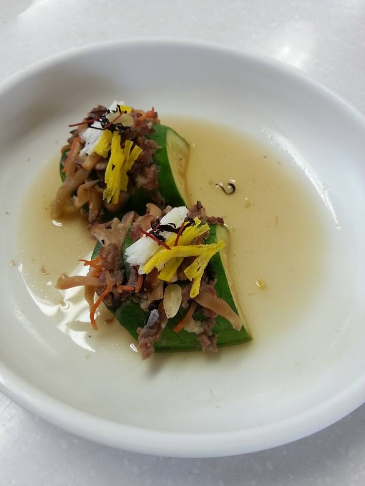 จานนี้เป็นซูกินีตุ๋นกับเนื้อวัวและแต่งหน้าด้วยไข่