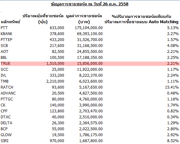 ข้อมูลการขายชอร์ต (SBL) 20 อันดับแรก ณ วันที่ 30 ต.ค. 2558 อันดับ 1 PTT มูลค่า ~370 ล้านบาท Cr. https://www.facebook.com/GreenDiaryOfTrader/