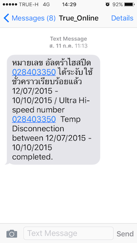 พอดี จขกท ทำการซ่อมบ้านคะ จำไประงับสัญญาณทรูมา เมื่อวันที่ 11/7/15 ที่ทรูช็อป สาขาเดอะมอลล์งามวงค์วาน โดยเจ้าหน้าที่ได้ทำการระงับให้ พร้อมบอกว่าจะมีค่ารักษาค่าบริการจำนวน 300 บาท โดยจะส่งบิลไปให้ที่บ้าน และกรณีถ้าบ้านยังไม่เสร็จ ให้ไปทำเรื่องอีกทีก่อนวันที่ 11/10/15 คะ ซึ่งหลังจากทำเรื่อง ก็มี massage ส่งเข้ามาที่เครื่องเพื่อระงับสัญญาณเรียบร้อย