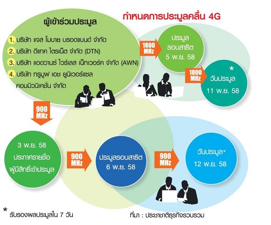 ถ้าจะบอกว่า ศึกชิงคลื่นครั้งนี้น่าตื่นเต้นกว่าเมื่อครั้ง 3G ด้วยว่ามีผู้เข้าแข่งขันในแต่ละใบอนุญาตมากกว่าจำนวนใบอนุญาตที่มี เพราะแต่ละคลื่นมี 2 ใบอนุญาต แต่มีผู้ยื่นซองประมูล 4 ราย ได้แก่ 1.บริษัท แจส โมบาย บรอดแบนด์ จำกัด 2.บริษัท ดีแทค ไตรเน็ต จำกัด (DTN) ในเครือ "ดีแทค" 3.บริษัท แอดวานซ์ ไวร์เลส เน็ทเวอร์ค จำกัด (AWN) ในเครือ "เอไอเอส" และ 4.บริษัท ทรูมูฟ เอช ยูนิเวอร์แซล คอมมิวนิเคชั่น จำกัด ในเครือ "ทรู"