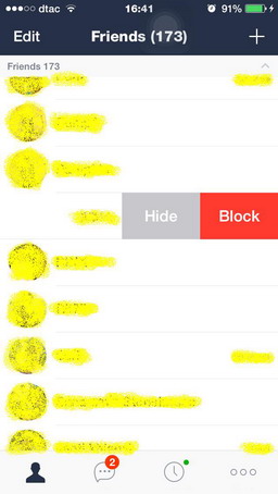 ก็ไปเห็นว่าที่หน้า Friends พอเราเลื่อนที่ชื่อใดมันก็จะมีแถบ Hideสีเทา กับ Blockสีแดง