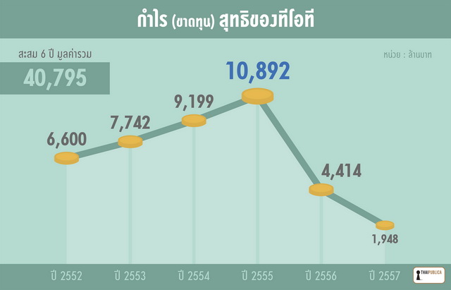แหล่งข่าวจากนักวิเคราะห์รายนี้ชี้ว่าเมื่อดูผลประกอบการย้อนหลัง 6 ปี ตั้งแต่ปี 2552-2557 จะพบว่าทีโอทีพึ่งพารายได้จากสัมปทานประมาณ 30% ของรายได้รวม หรือคิดเป็นรายได้จากสัมปทานรวม 6 ปี 125,997 ล้านบาท เฉลี่ยตกปีละประมาณ 20,000 ล้านบาท จากรายได้รวม 6 ปี 451,453 ล้านบาท เฉลี่ยตกปีละ 75,000 ล้านบาท แต่ถ้าหากตัดรายได้จากสัมปทานส่วนนี้ไป พบว่าผลประกอบการในช่วง 6 ปีที่ผ่านมาขาดทุนทุกปี เฉลี่ยปีละ 14,000 ล้านบาท รวม 6 ปีขาดทุนสะสมกว่า 85,000 ล้านบาท