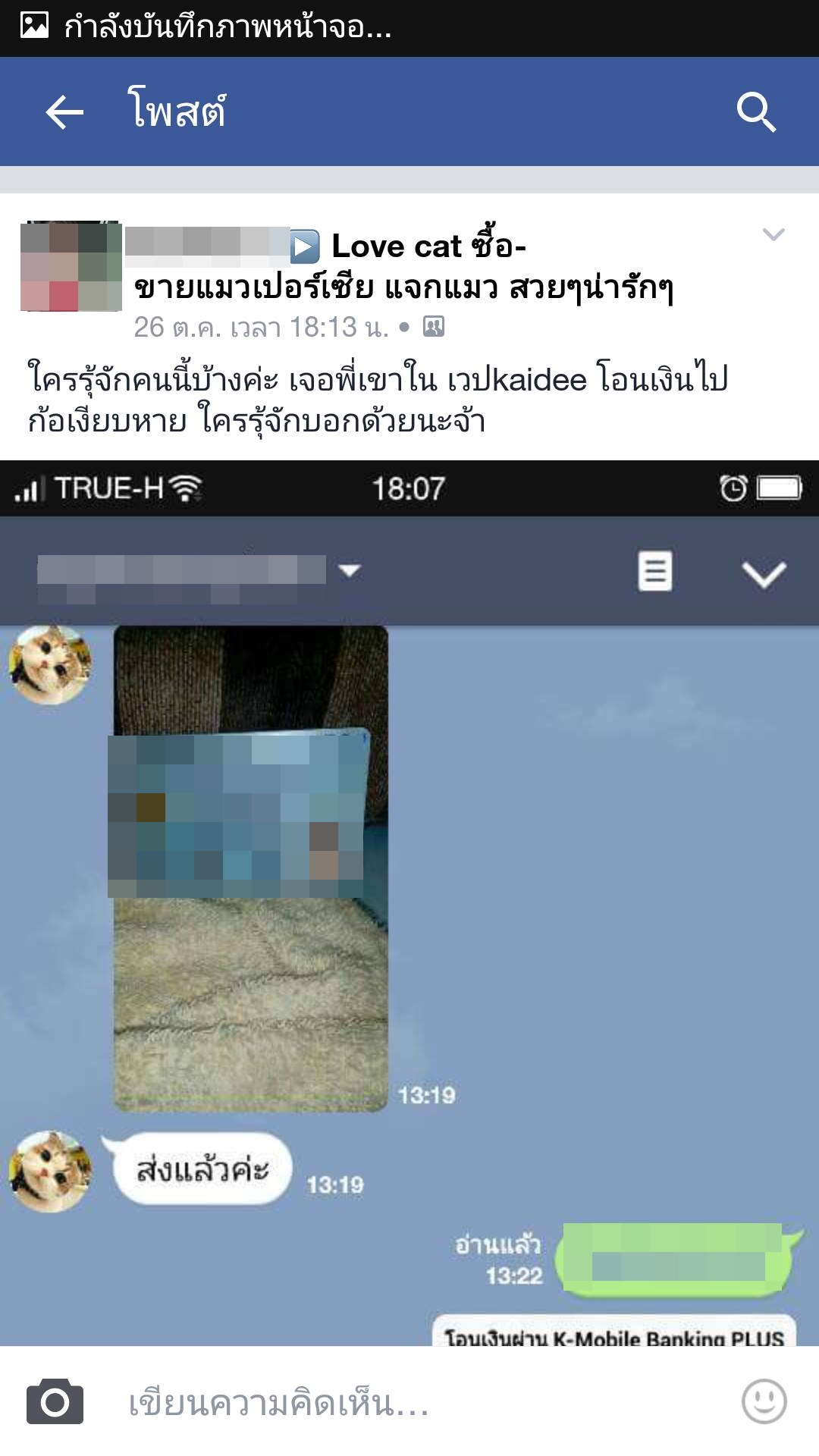 และก็โอนเงินไป 9000 บาทครบจำนวน และส่งสลิปให้ไปทางไลน์ หลังจากนั้นเราก็ไม่ได้คุยอะไรไปอีก เพราะคิดว่าเขากำลังจัดส่ง พอประมาณบ่าย 3 ครึ่ง เราก็เลยลังเลใจ อยากได้เอ็กโซติคสีน้ำตาลที่เขาลงไว้นั้น เพราะสีขาวคงน้ำตาเยอะ จะไม่สวย เลยไลน์ไปขอเปลี่ยนตัวทันไหม เขาก็ไม่อ่าน โทรไปเป็น 4-5 สายก็ไม่รับ เลยคิดว่า เขาคงไปส่งแมวที่สนามบินแล้วมั้ง ก็เลยคิดว่า ไม่เป็นไร สีขาวก็สีขาว พอตก 6 โมงเย็น ตามที่คุยกันไว้ว่าแมวจะมาถึงเชียงใหม่ 6 โมง ก็เริ่มแปลกใจว่าพี่เขาทำไมยังไม่ส่งบิทการส่งแมวมาให้ ก็เลยโทรหา เอาเบอแปลกโทรไปก็ยังไม่รับ เพื่อนแนะนำให้ลองเอาไปโพสลงกลุ่มแมวซิ ว่าใครเคยซื้อขายกับคนๆนี้ไหม เราก็ทำตาม