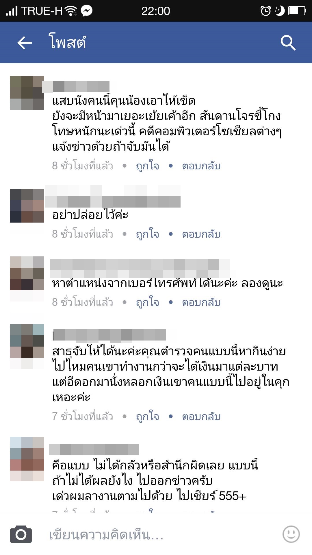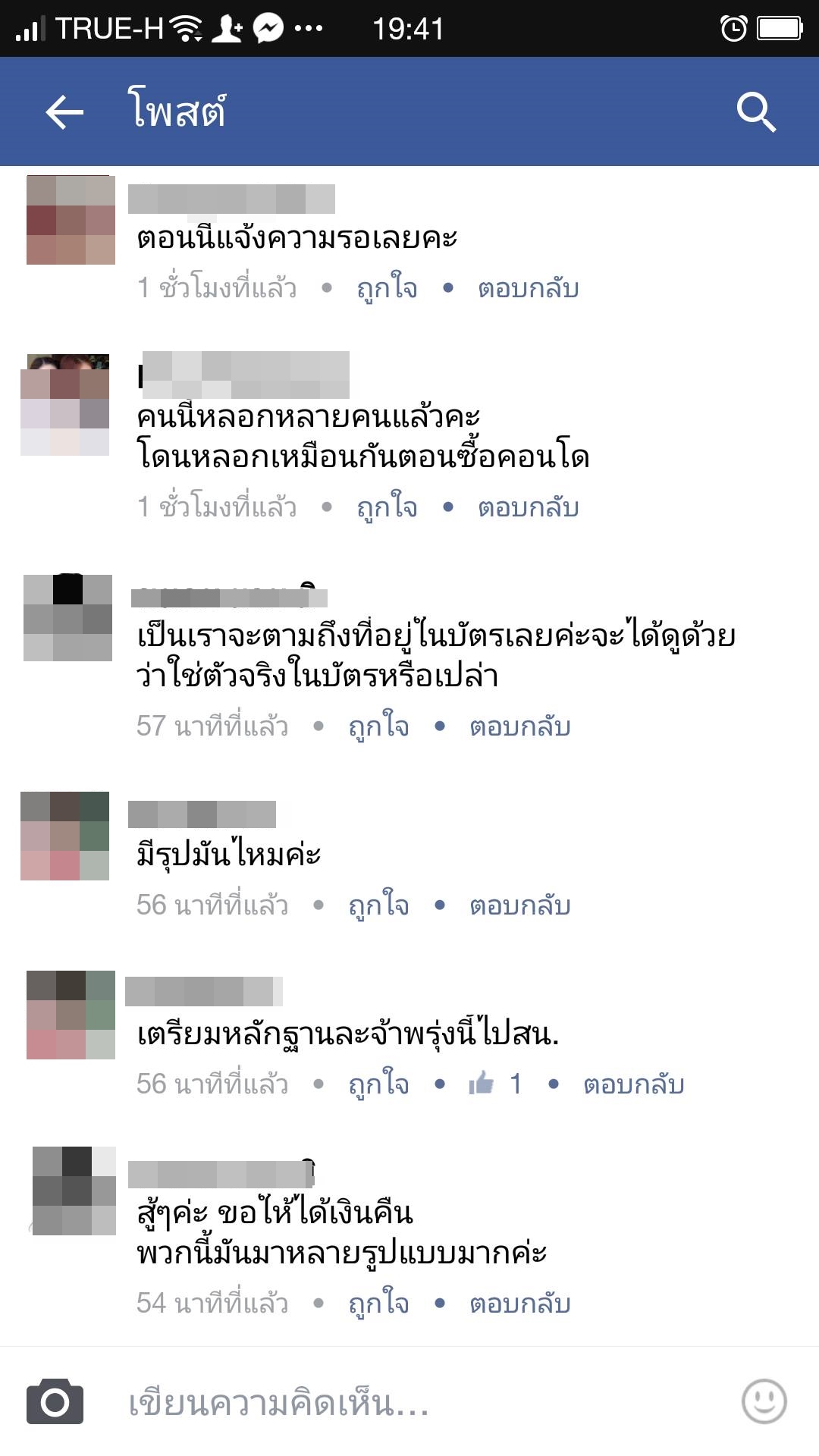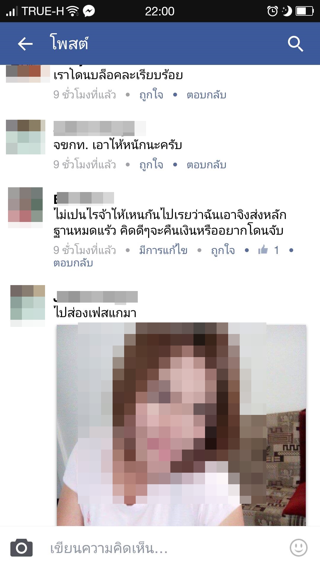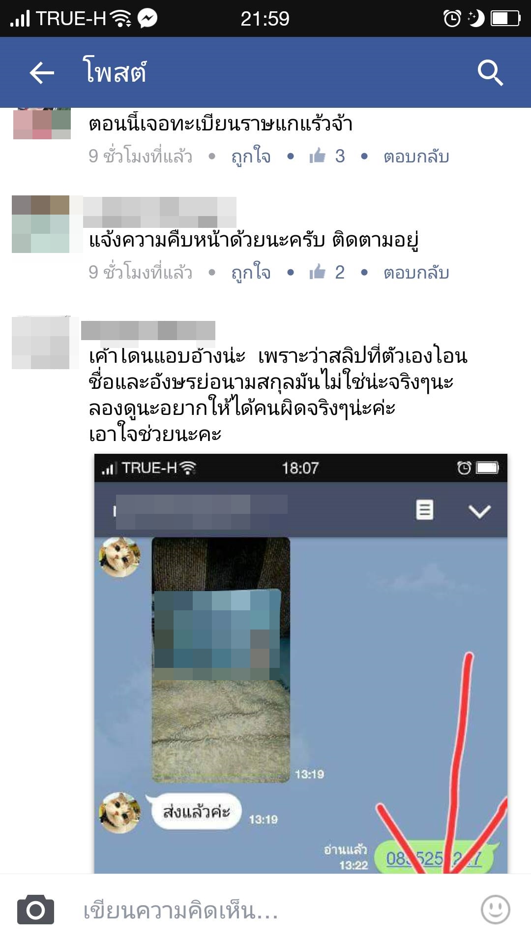 คือเขาไม่ได้กลัวอะไรเลย แถมยังท้าทายอีกด้วยคือทุกคนก็ทำอะไรเขาไม่ได้ เพราะมันเป็นเฟสบุ๊ค และก็มีอีกคนที่มาคอมเม้นต่อว่าโดนเหมือนกัน โดนเป็นหมื่น ก็เลยคิดว่าคนที่โดนบุคคลนี้โกงต่อมีมากกว่านี้แน่ๆ แล้วทำไมเขายังไม่โดนจับ ยังลอยนวลมาถึงทุกวันนี้ ถามในกลุ่มที่โดนโกงไป ก็มีคนบอกว่าแจ้งความไปแล้ว แต่ตำรวจไม่ดำเนินการให้ คือไม่ได้ต้องการเงินคืนเพราะคิดว่าคงไม่ได้คืนแล้วแน่ๆแต่อยากให้บุคคลนี้ที่ทำผิดโดนจับและดำเนินคดีตามกฏหมาย ไม่อยากให้ใครต้องมาตกเป็นเหยื่อรายต่อไป ขอให้พี่ๆน้องๆทุกคน ช่วยกันดันกระทู้นี้ขึ้นไป ถือว่าช่วยกันทำบุญ ให้ไปถึงคุณสรยุทธ์ และทีมงานเรื่องเล่าเช้านี้ให้ช่วยประสานงานไปยังตำรวจให้จับตัวคนร้ายมาดำเนินคดีด้วยค่ะ ขอบคุณค่ะ