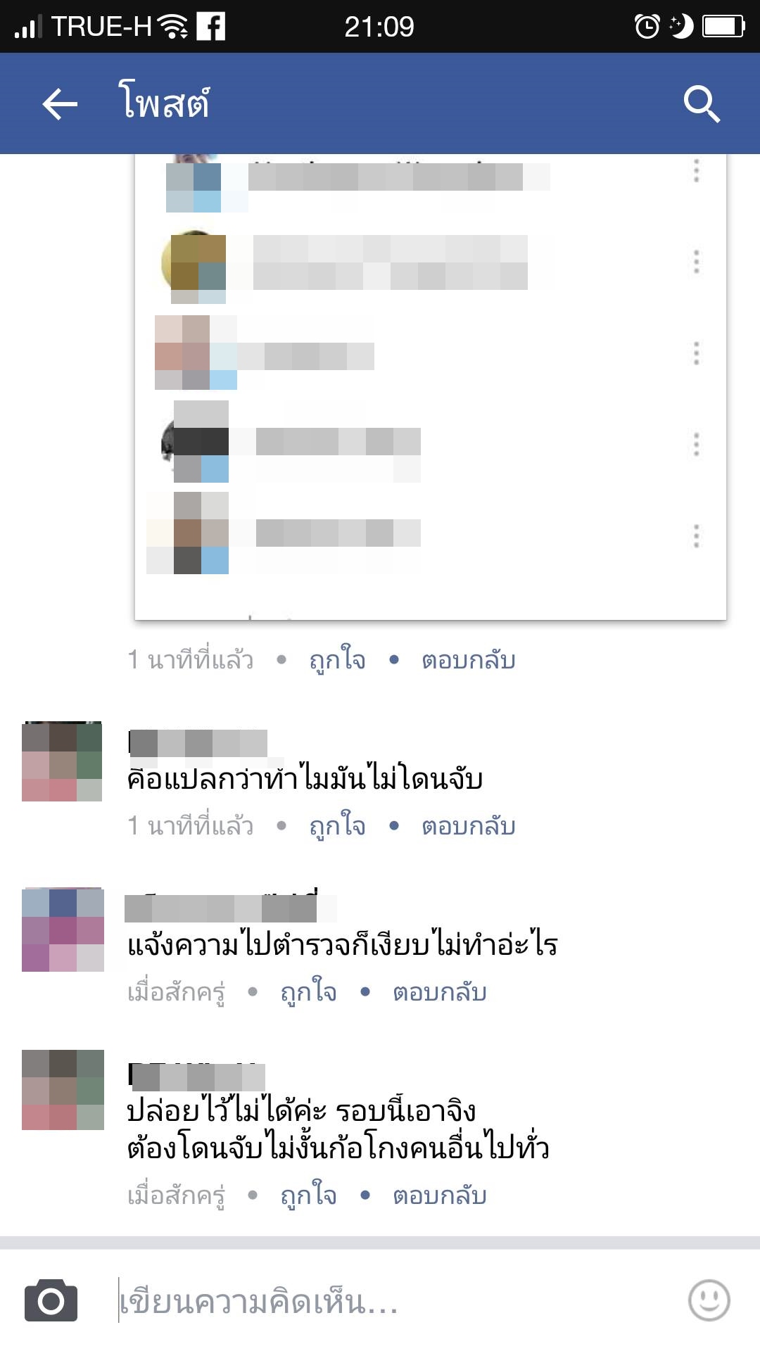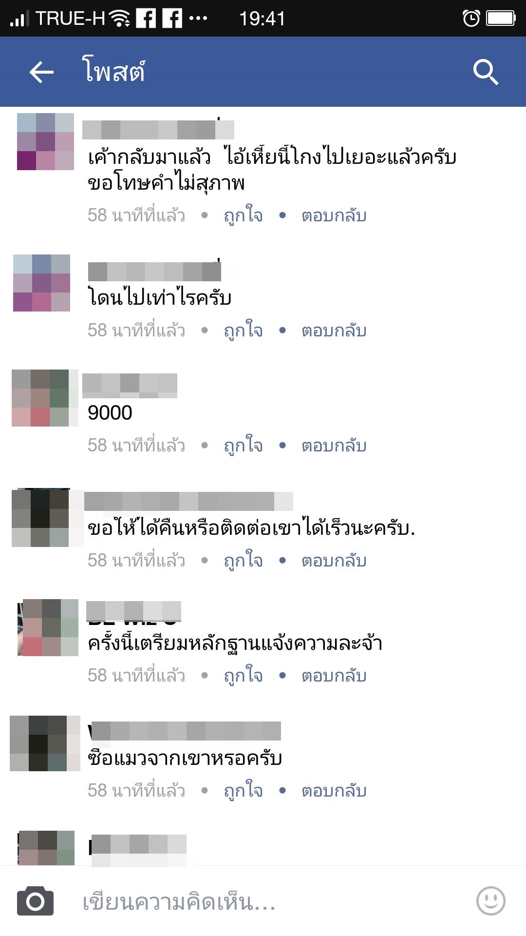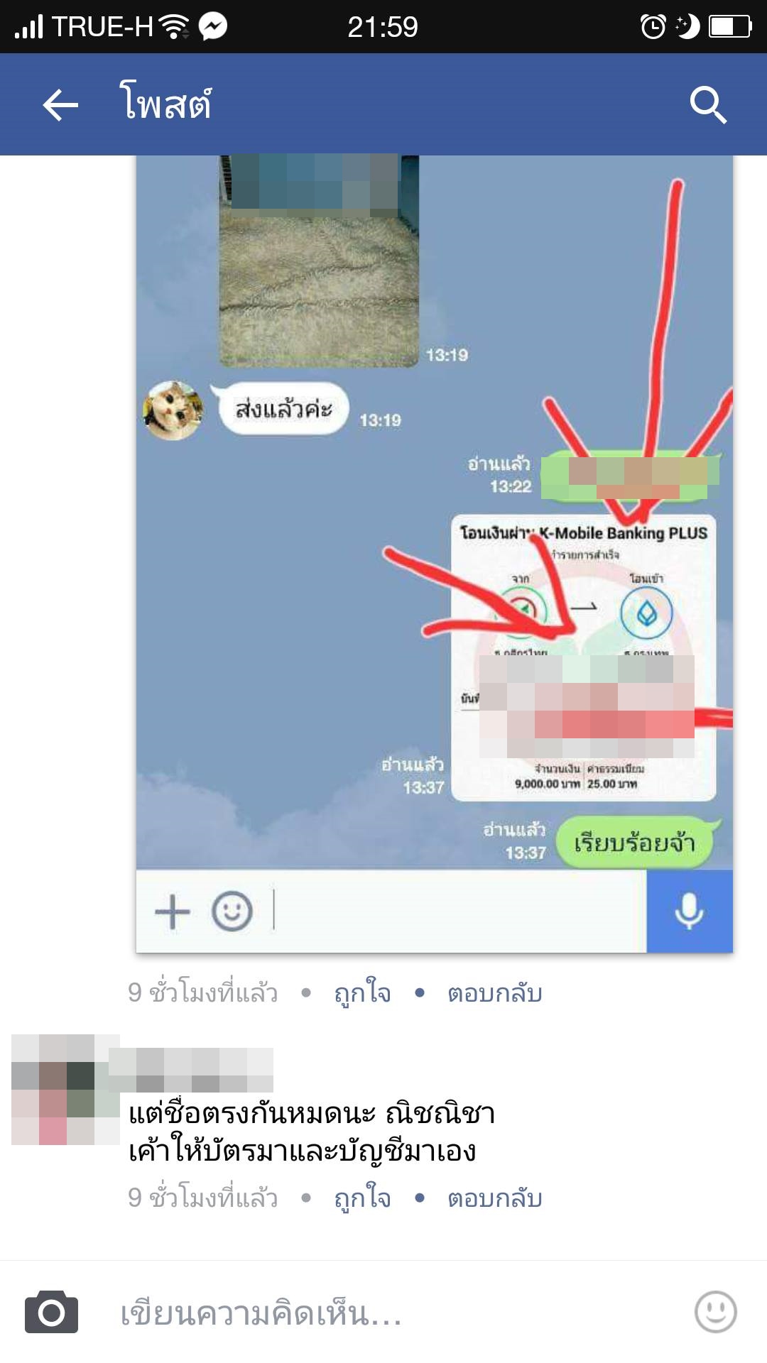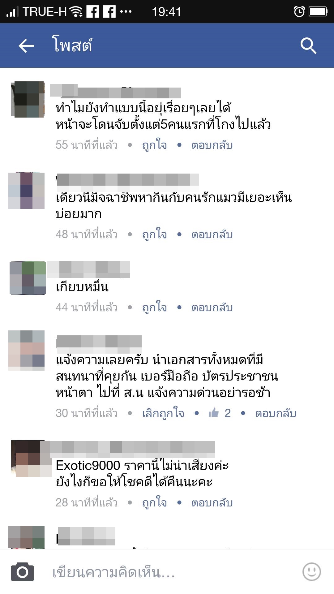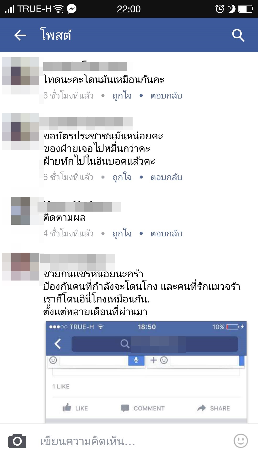 คือเขาไม่ได้กลัวอะไรเลย แถมยังท้าทายอีกด้วยคือทุกคนก็ทำอะไรเขาไม่ได้ เพราะมันเป็นเฟสบุ๊ค และก็มีอีกคนที่มาคอมเม้นต่อว่าโดนเหมือนกัน โดนเป็นหมื่น ก็เลยคิดว่าคนที่โดนบุคคลนี้โกงต่อมีมากกว่านี้แน่ๆ แล้วทำไมเขายังไม่โดนจับ ยังลอยนวลมาถึงทุกวันนี้ ถามในกลุ่มที่โดนโกงไป ก็มีคนบอกว่าแจ้งความไปแล้ว แต่ตำรวจไม่ดำเนินการให้ คือไม่ได้ต้องการเงินคืนเพราะคิดว่าคงไม่ได้คืนแล้วแน่ๆแต่อยากให้บุคคลนี้ที่ทำผิดโดนจับและดำเนินคดีตามกฏหมาย ไม่อยากให้ใครต้องมาตกเป็นเหยื่อรายต่อไป ขอให้พี่ๆน้องๆทุกคน ช่วยกันดันกระทู้นี้ขึ้นไป ถือว่าช่วยกันทำบุญ ให้ไปถึงคุณสรยุทธ์ และทีมงานเรื่องเล่าเช้านี้ให้ช่วยประสานงานไปยังตำรวจให้จับตัวคนร้ายมาดำเนินคดีด้วยค่ะ ขอบคุณค่ะ
