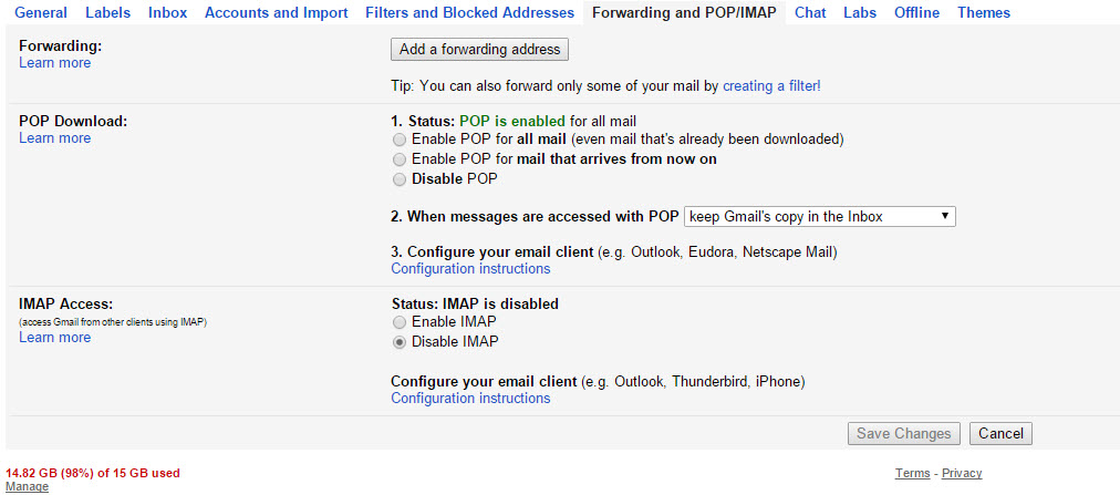 โดยใน Gmail เราได้ Enabled POP แล้วตามภาพ