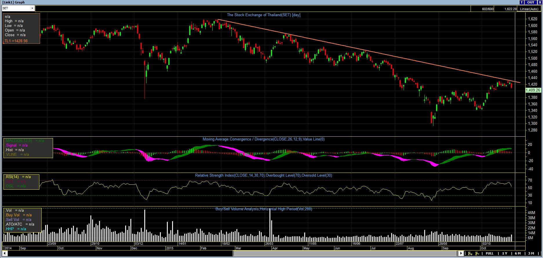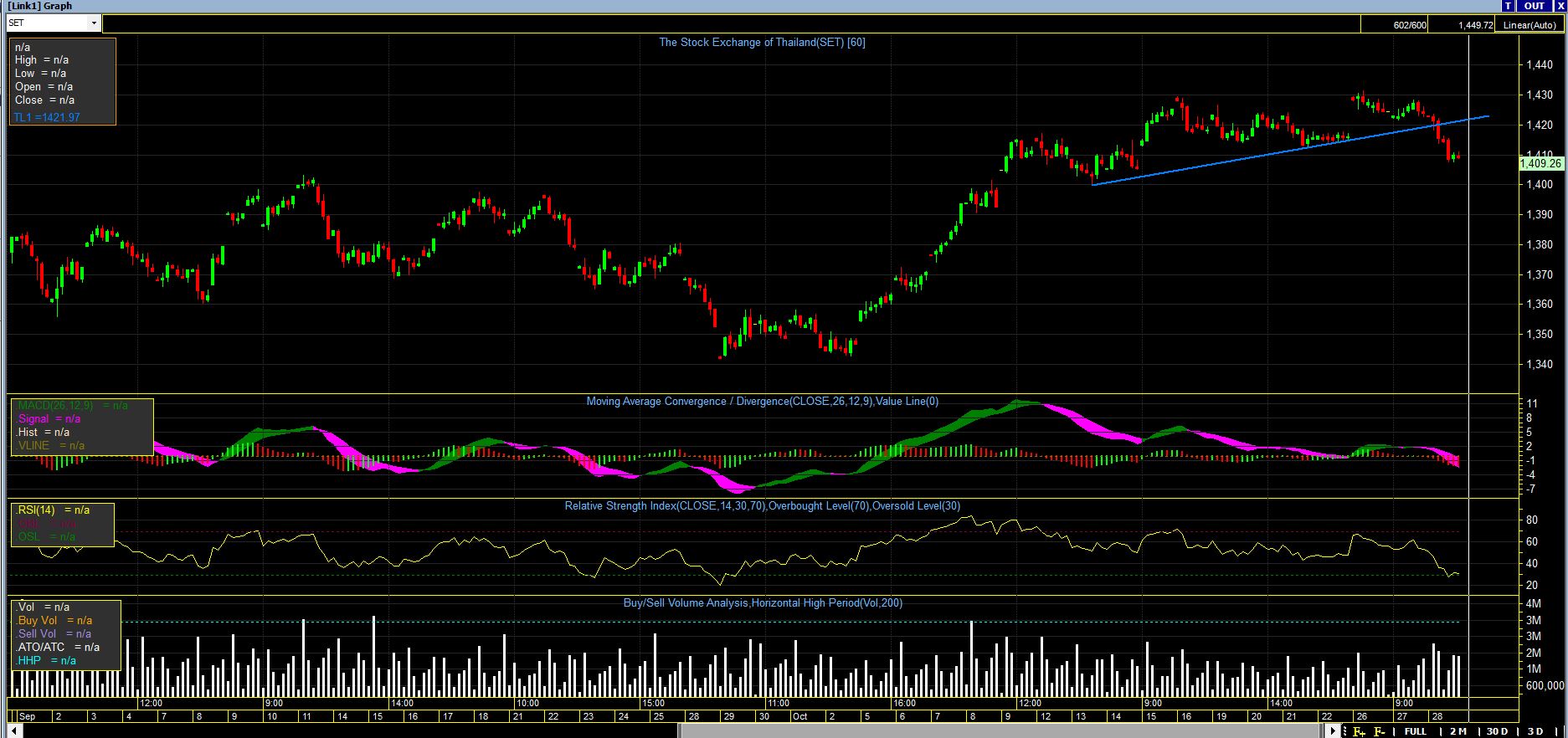 เพิ่งทะลุลงมาแบบนี้ มีหวังลุ้นเด้ง คน S อยู่ก็รอไปเลย เพราะเมื่อหลุดเส้น TL แนวโน้มทางขึ้นจะถูกลดทอนไป แต่ถ้าเอาชัวก็หลุด 1400 ไปเลย ตอนนี้อาจมีเด้งแล้วดูแถว 1420 อีกที ที่เพิ่งเคยเป็นแนวรับแข็งแกร่ง ตอนนี้เป็นแนวต้านแล้ว อาจไปทดสอบตรงนั้น แต่ถ้าเลือกที่จะลงต่อ ก็เอาให้หลุด 1400 ไปเลย น้ำหนักเริ่มมาทางลง จบข่าว!!