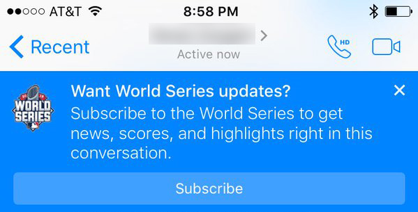 เฟซบุ๊ก กำลังเดินตามรอยทวิตเตอร์แบบเรียลไทม์เช่นเดียวกับฟีเจอร์ เมื่อล่าสุด มีรายงานจากผู้ใช้ Messenger คนหนึ่งเปิดเผยว่า เฟซบุ๊กได้มีการแจ้งเตือนให้เขาสมัครสมาชิกกับ MLB World Series เพื่อรับข้อมูลเกี่ยวกับผลการแข่งขัน และไฮไลท์ผ่านทางหน้าต่างแชทแบบ 1-1