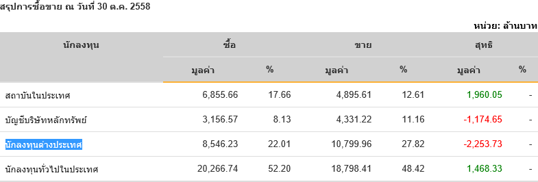 Sinthorn Summary 30/10/2558 : ต่างชาติขายสุทธิ -2,253.73 ลบ.