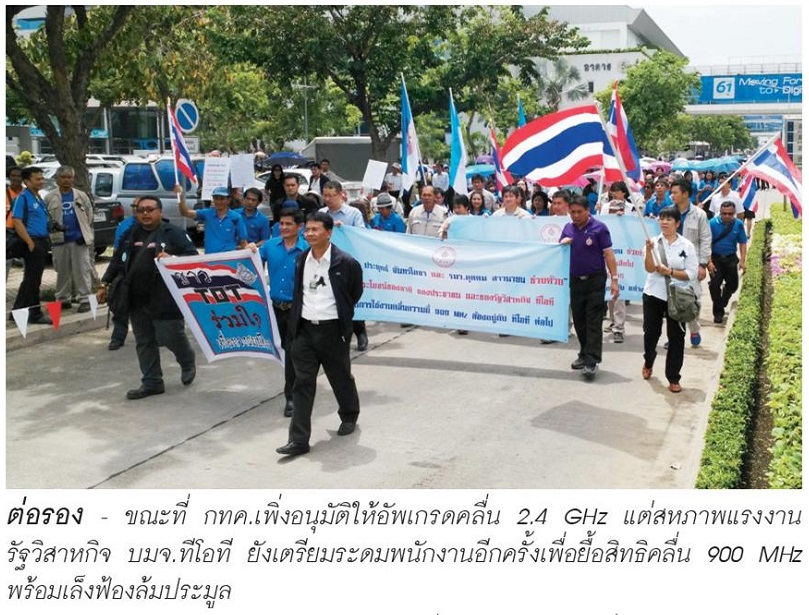 สมาชิกสหภาพแรงงานรัฐวิสาหกิจ บริษัท ทีโอที หลายร้อยคนนัดรวมตัวกันที่สำนักงานใหญ่ ทีโอที เมื่อวันที่ 30 ต.ค.ที่ผ่านมา เพื่อรอฟังคำตอบจากที่ประชุมคณะกรรมการว่า จะมีมติฟ้องศาลปกครองให้ระงับการประมูลคลื่นความถี่ 900 เมกะเฮิรตซ์ หรือไม่