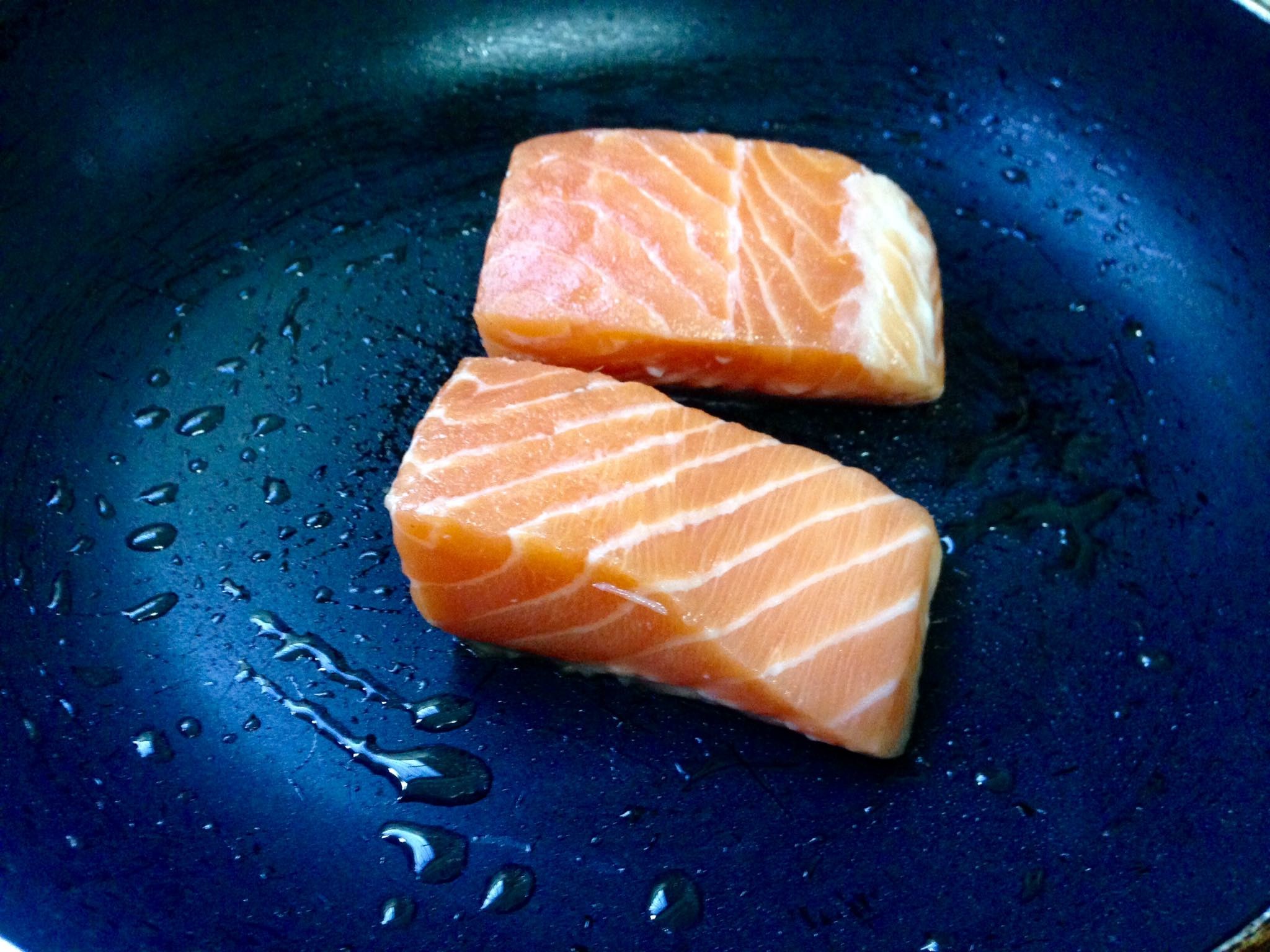 มาเอาปลาแซลมอนจี้กระทะให้พอสุกกันสักหน่อยครับ