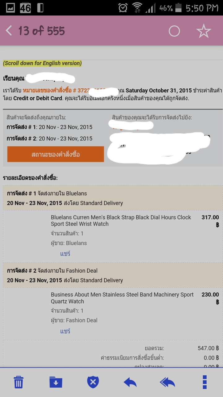 แล้วอีกอันนึง เราสั่งซื้อนาฬิกาไป 2 เรือน ดูแล้วก็น่าจะมาจาก ตปท อีกเหมือนกัน แต่อันนี้เราตัดจากบัตรเดบิตไป ใส่เลขบัตรเรียบร้อย ก็เช่นกัน มีเมลยืนยันคำสั่งซื้อมาให้ แต่ครั้งนี้ลองเช็กกับบัญชีตัวเองแล้วคะ แต่ไม่มีการตัดเงินจากบัญชีแต่อย่างใดเลย มันคือยังไงคะ ตกลงสั่งของได้ไหม หรือยังไง ไม่ได้เราจะได้สั่งใหม่ค่ะ
