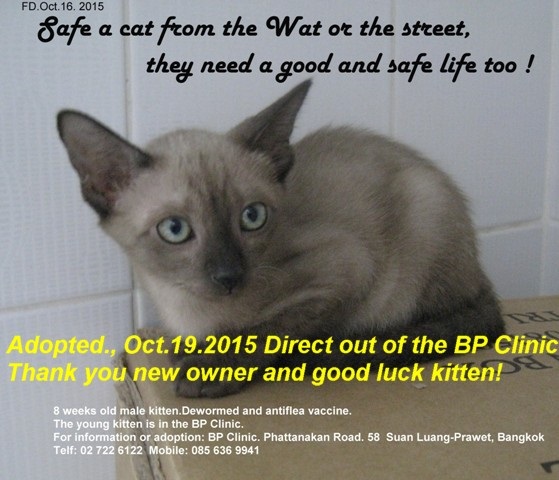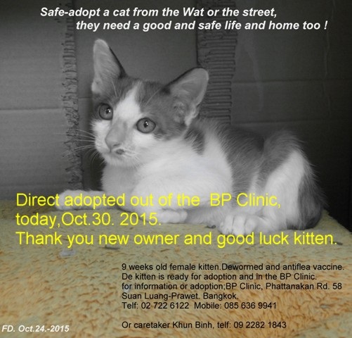 It's the same owner as from the brown kitten which she took last week. ไปอยู่ที่เดียวกับลูกแมวสีน้ำตาล ที่มีคนใจรับไปอุปการะก่อนหน้านี้ (19/10/2015)