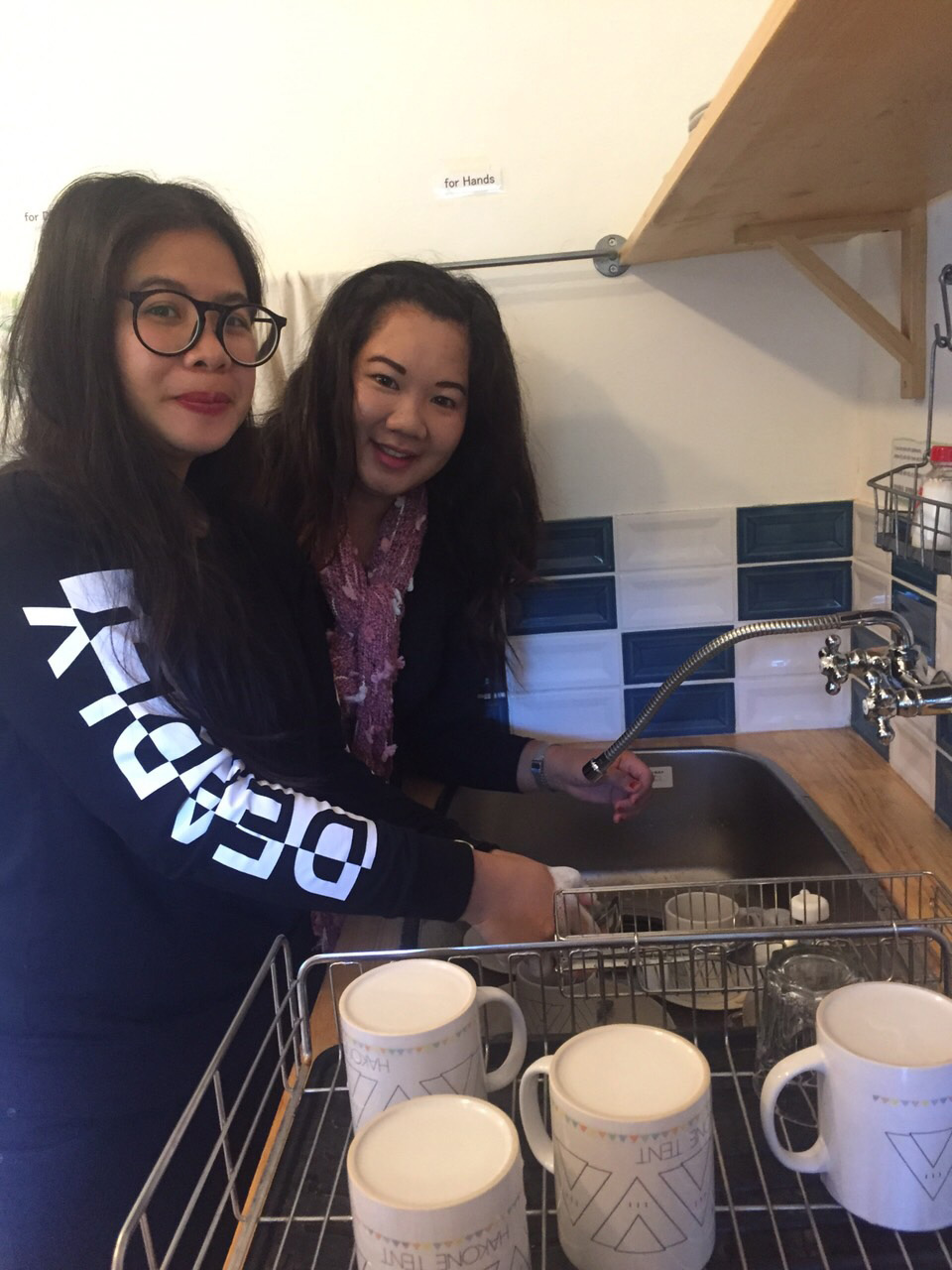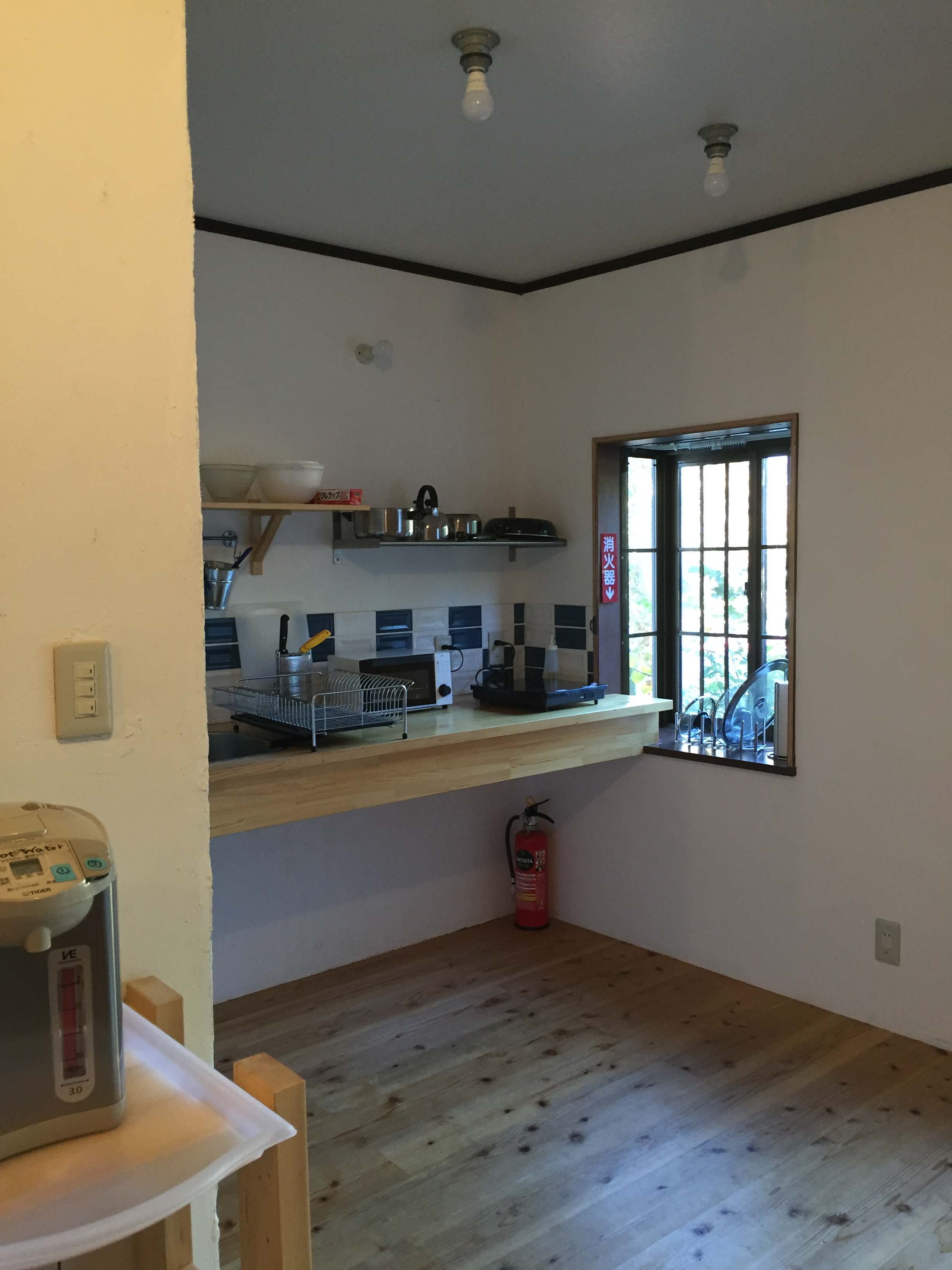 จะมีมุม ชา กาแฟ ให้เราชงดื่มได้ตลอด มีโต๊ะทานอาหาร 2 โต๊ะ มุม ประกอบอาหาร มีเครื่องครัวเตรียมไว้ให้เราเรียบร้อย สะดวกมาก แต่เราต้องล้างจานเองนะ หลังจากที่เราใช้แล้วด้วยนะ