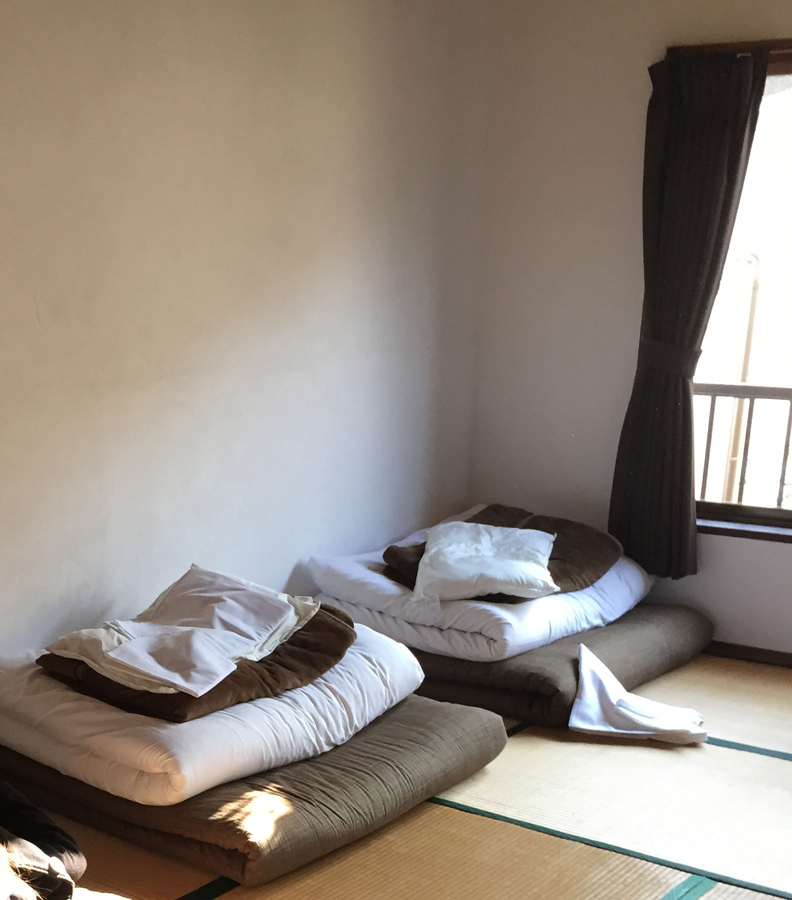 สำหรับห้องพัก ยังคงเอกลักษณ์แบบดั้งเดิม ปูเสื่อทาทามิข้างในห้อง อย่าใส่รองเท้าเข้าไปเหยียบนะ ตอนที่แนะนำส่วนต่างๆ เจ้าหน้าที่จะอธิบายบอกเราด้วยคือมีฟูกปูนอนกับพื้นเลย มีหมอน ผ้าห่มให้ มีวิธีปูทีนอนบอกไว้ด้วยนะ ขอบอกเลยนะที่นี่ยังคงเป็นโรงแรมแบบ เกสเฮ้าส์ สำหรับแบคเพค ภายในห้องจะมีที่แขวนผ้ากับไม้แขวน กระจกบานใหญ่ กับ ที่นอน เท่านั้น นะ