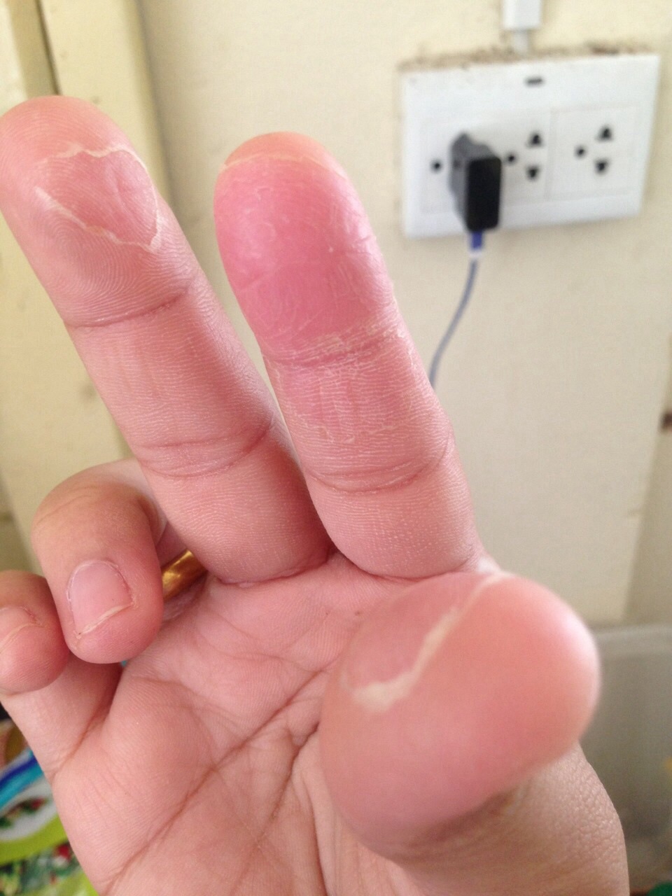 ปลายนิ้วทั้งมือซ้ายและขวา ผมลอกจนบาง และเกิดแผลง่ายมากครับ ทำงานไม่สะดวกเลย ต้องพันพลาสเตอร์ใว้กันเจ็บ เป็นทั้งนิ้วโป้งกลาง นางชี้ เว้นนิ้วก้อย ปกติจะไม่แพ้อะไรเลย จะมีสัมผัสกับสารเคมีแรงๆก็ตอนที่ซัก