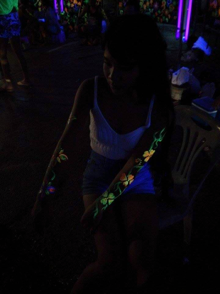 ของเราให้เขาวาดให้ เป็นรูปดอกไม้แขนสองข้างราคาสองร้อยบาท อยู่ในที่มืดดอกไม้ก้อจะสะท้อนแสงแบบนี้ สวยงามมาก