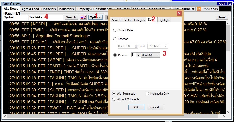 การค้นหาข่าวของหุ้นที่เราสนใจ ทางโปรแกรมของ Efin stock pickup มีระบบค้นหาข่าวของหุ้นตัวที่เราสนใจสามารถเข้าไปกดที่ปุ่ม news ตรงเมนูได้เลย ตามปกติโปแกรมจะตั้งค่ามาตรฐานคือจะแสดงเฉพาะข่าวที่มีในวันนั้น ถ้านักลงทุนต้องการค้นหาข่าวย้อนหลังก็ต้องไปตั้งค่าดังภาพ