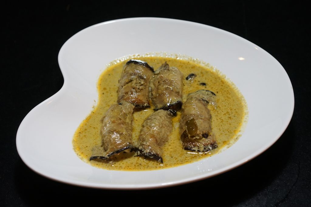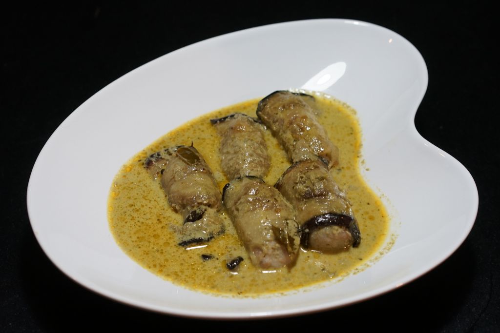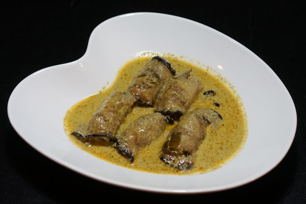 มะเขือม่วงหั่นตามแนวยาวเป็นชิ้นหนา 5 มม. นำไปทอดให้เนื้อนิ่ม นำไปห่อเนื้อปลากรายที่นวดจนเหนียว นำไปทำแกงเขียวหวาน