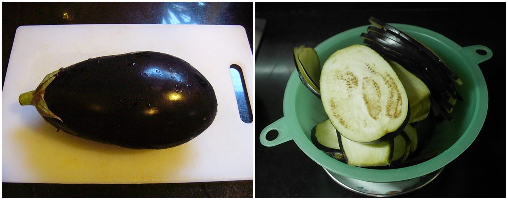 มะเขือม่วง หั่นตามแนวยาวเป็นชิ้นหนา 5 มม. (ใช้เคร่อง Slide)