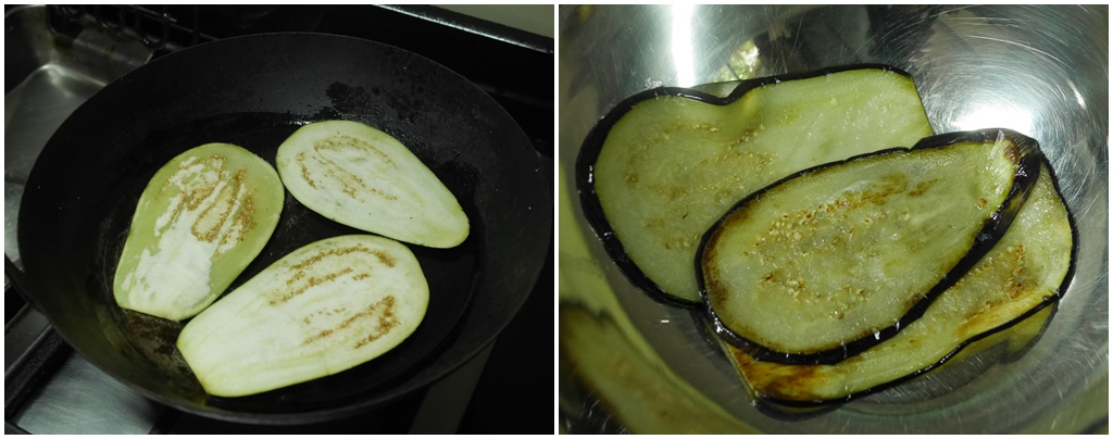นำมะเขือม่วงไปทอดน้ำมันติดกระทะ ทอดให้เนื้อนิ่ม เพื่อที่จะม้วนห่อเนื้อปลากราย
