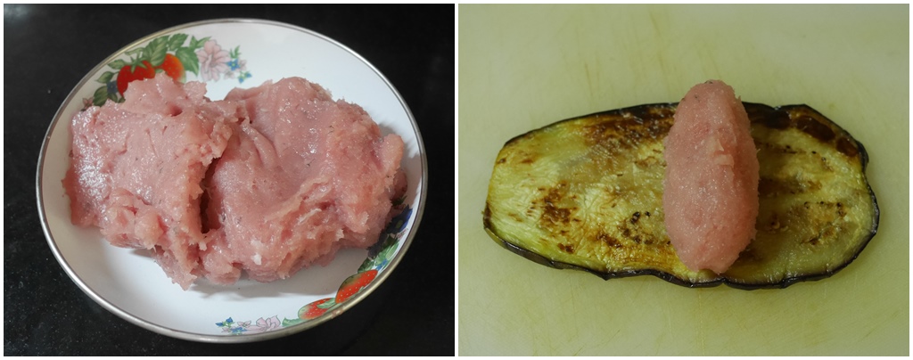 เนื้อปลากราย นำไปนวดให้เหนียวก่อน เอามะเขือม่วงห่อ