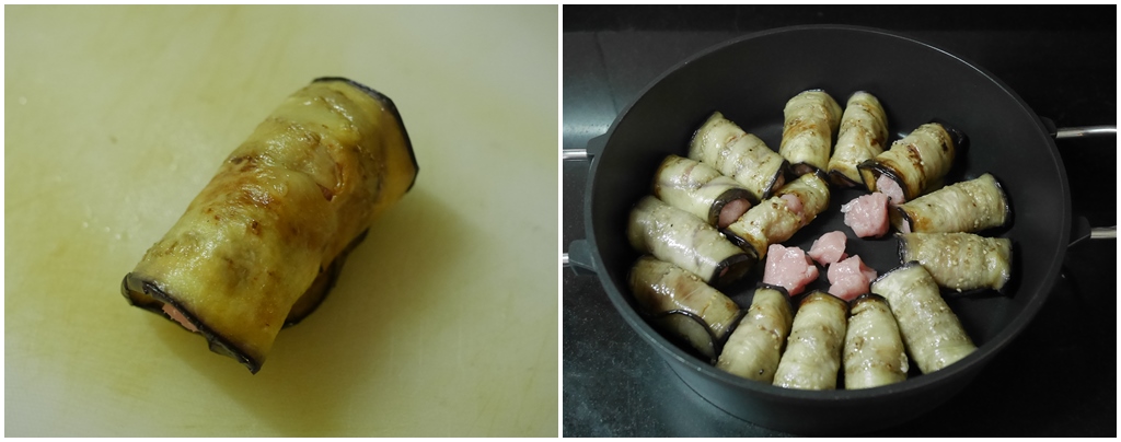 นำมะเขือม่วงที่ห่อปลากรายเรียงในก้นหม้อทรงแบนกว้าง