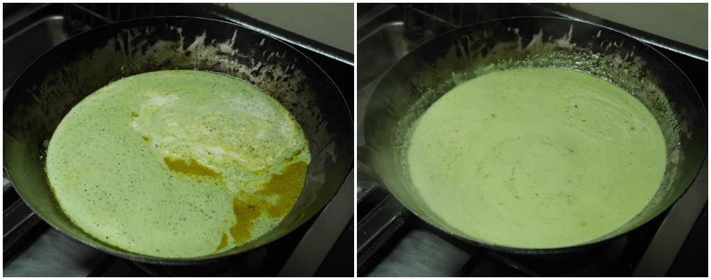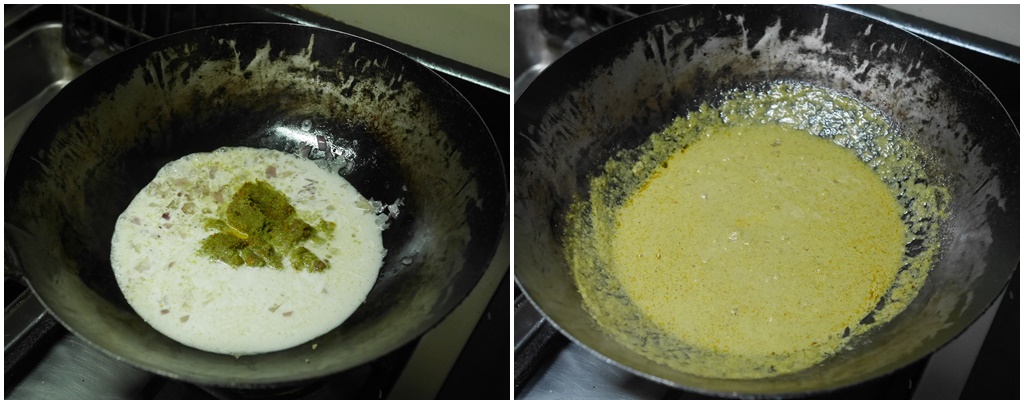 ทำแกงเขียวหวานในกระทะ เอาพริกแกงเขียวหวานไปผัดกับหัวกะทิ 2 ถ้วย ผัดไฟอ่อนประมาณ 7 - 8 นาที จนกะทิแตกมัน
