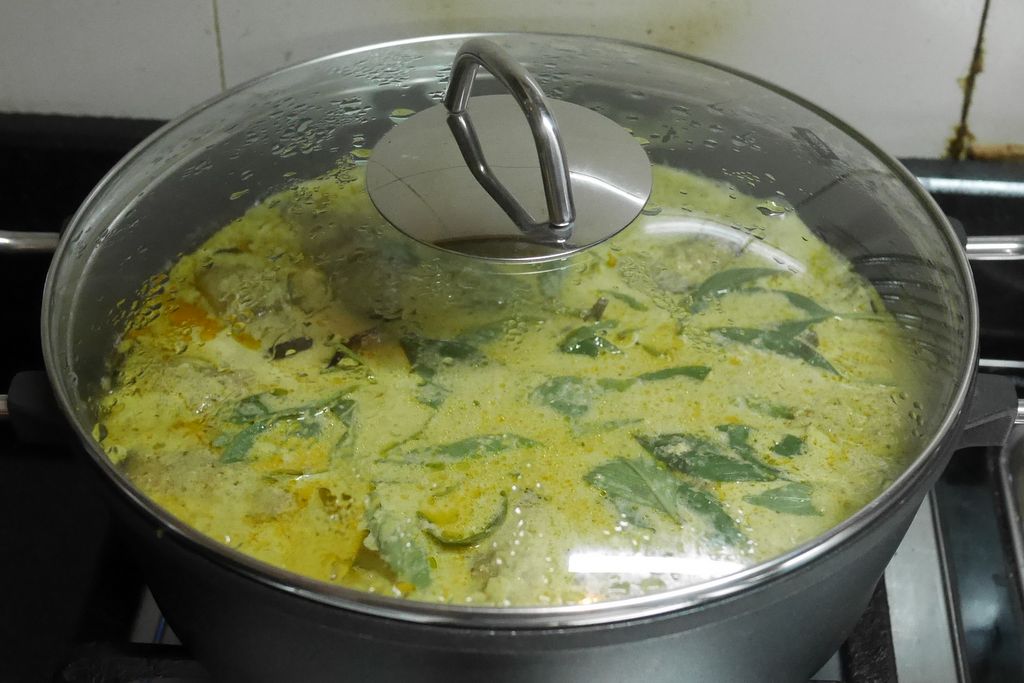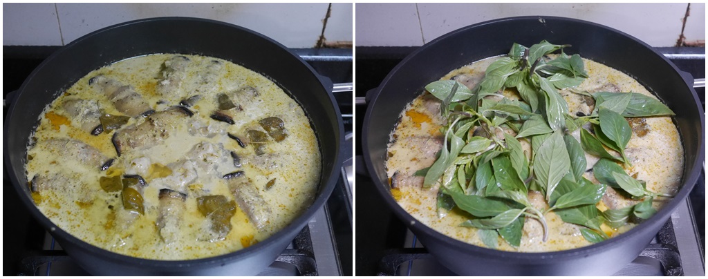 เติมใบมะกรูด ปรุงรสด้วยน้ำปลา ตั้งให้เดือด เคี่ยวไปจนกระทั่ง เนื้อปลากรายสุก ประมาณ 10 นาที เติมโหระพา