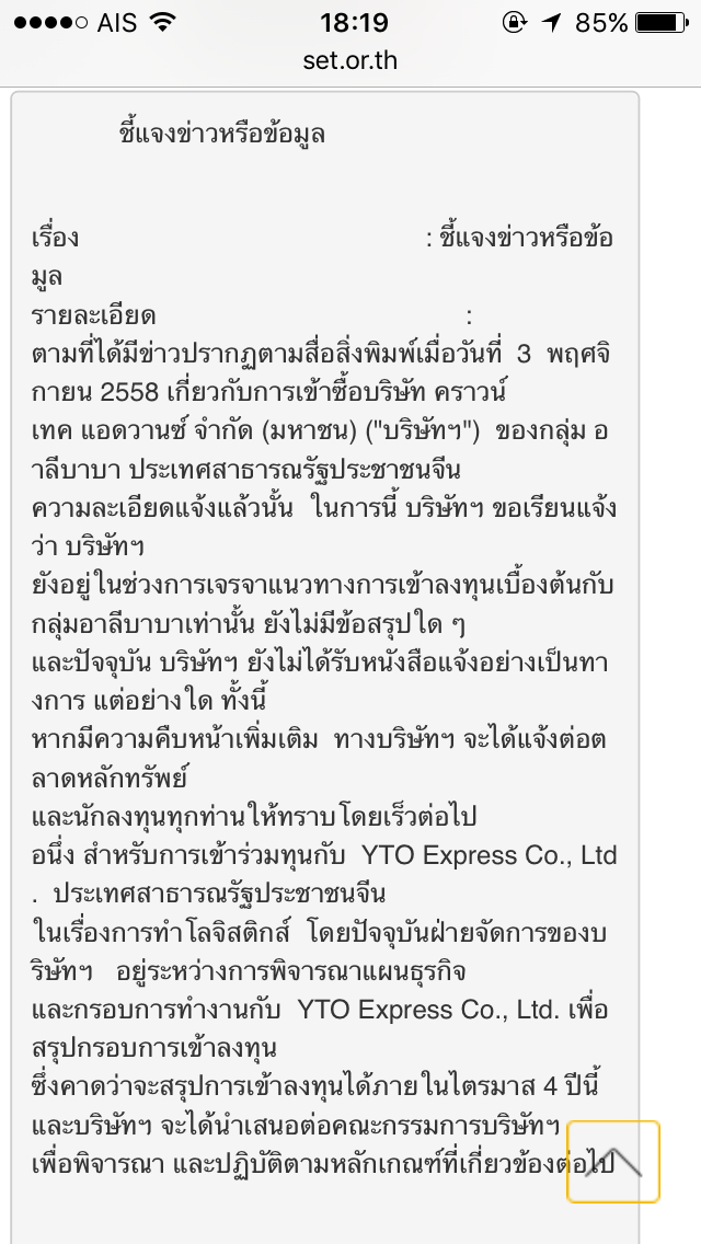 AJD คาด พ.ค.นี้ สรุปความร่วมมือกับ 2 แบงก์ใหญ่ ช่วยป้อนลูกค้า SME สมัครสมาชิกซื้อขายสินค้าผ่านเว็บ Alibaba Investor Relations Info : AJD สำนักข่าวอีไฟแนนซ์ไทย- -18 พ.ค. 59 11:06 น.