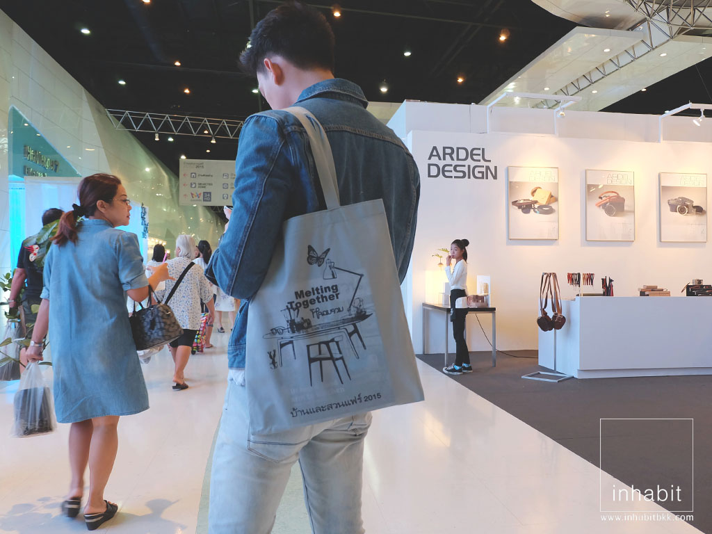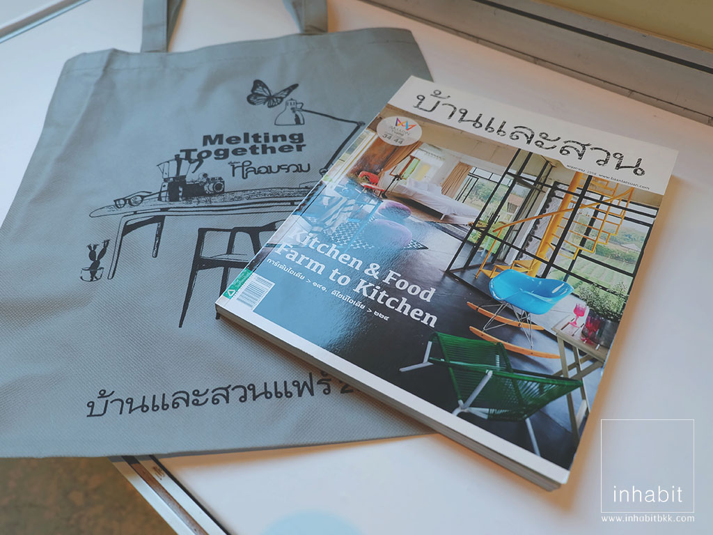 นอกจากจะแจกแผ่นพับและแผนที่ภายในงานแล้ว ที่จุดนี้ยังแจกกระเป๋าผ้าลดโลกร้อนและนิตยสารบ้านและสวนไปอ่านกันฟรีๆ