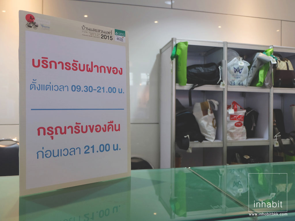 สำหรับใครที่มีของพะรุงพะรังแล้วไม่อยากเดินถือเข้าไปในงาน บริเวณจุดลงทะเบียก็มีจุดรับฝากของนะครับ หรือใครที่เดินเที่ยวงานแล้วเผลอช้อปปิ้งเพลิน รู้ตัวอีกทีก็มีของเต็มสองมือแล้วยังไม่จุใจ ก็สามารถนำของมาฝากไว้ก่อนแล้วกลับเข้าไปช้อปปิ้งใหม่ได้ครับ