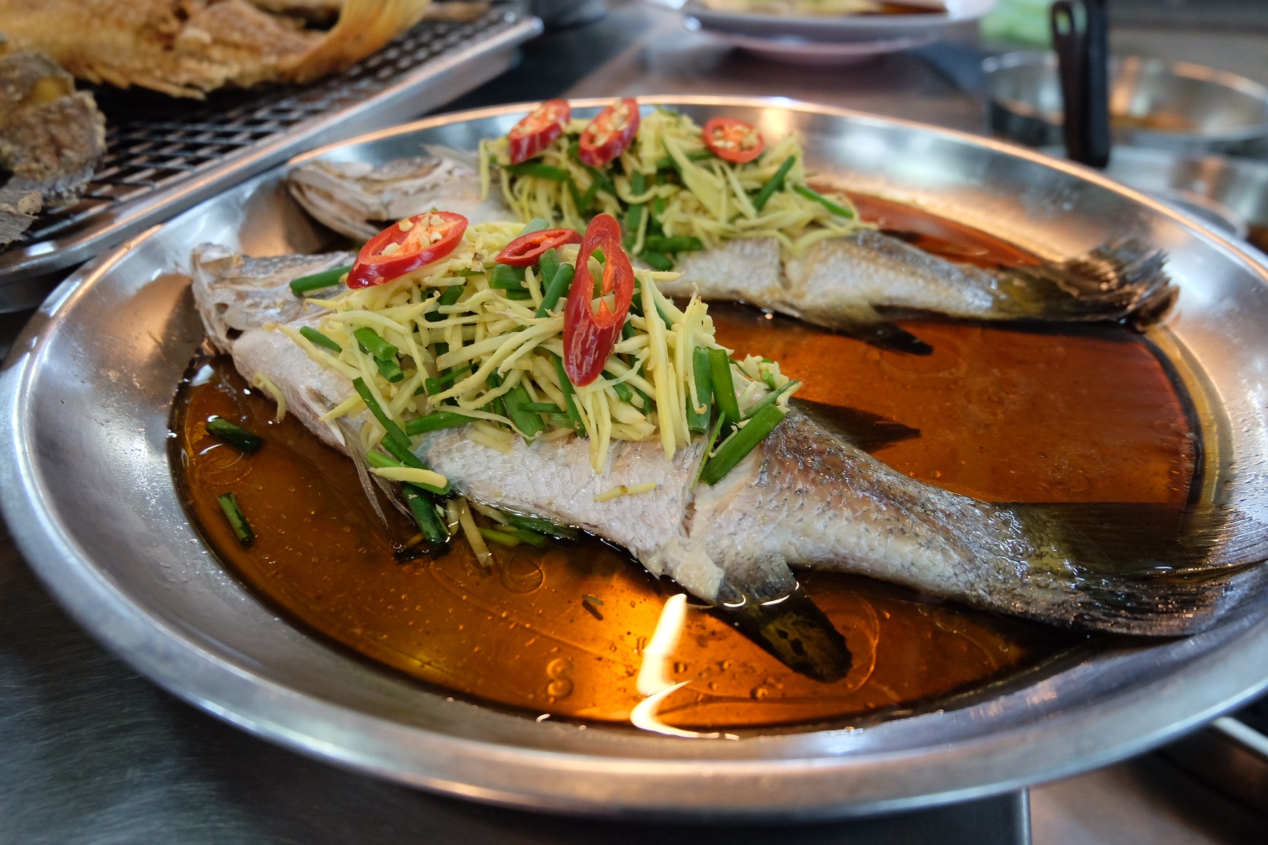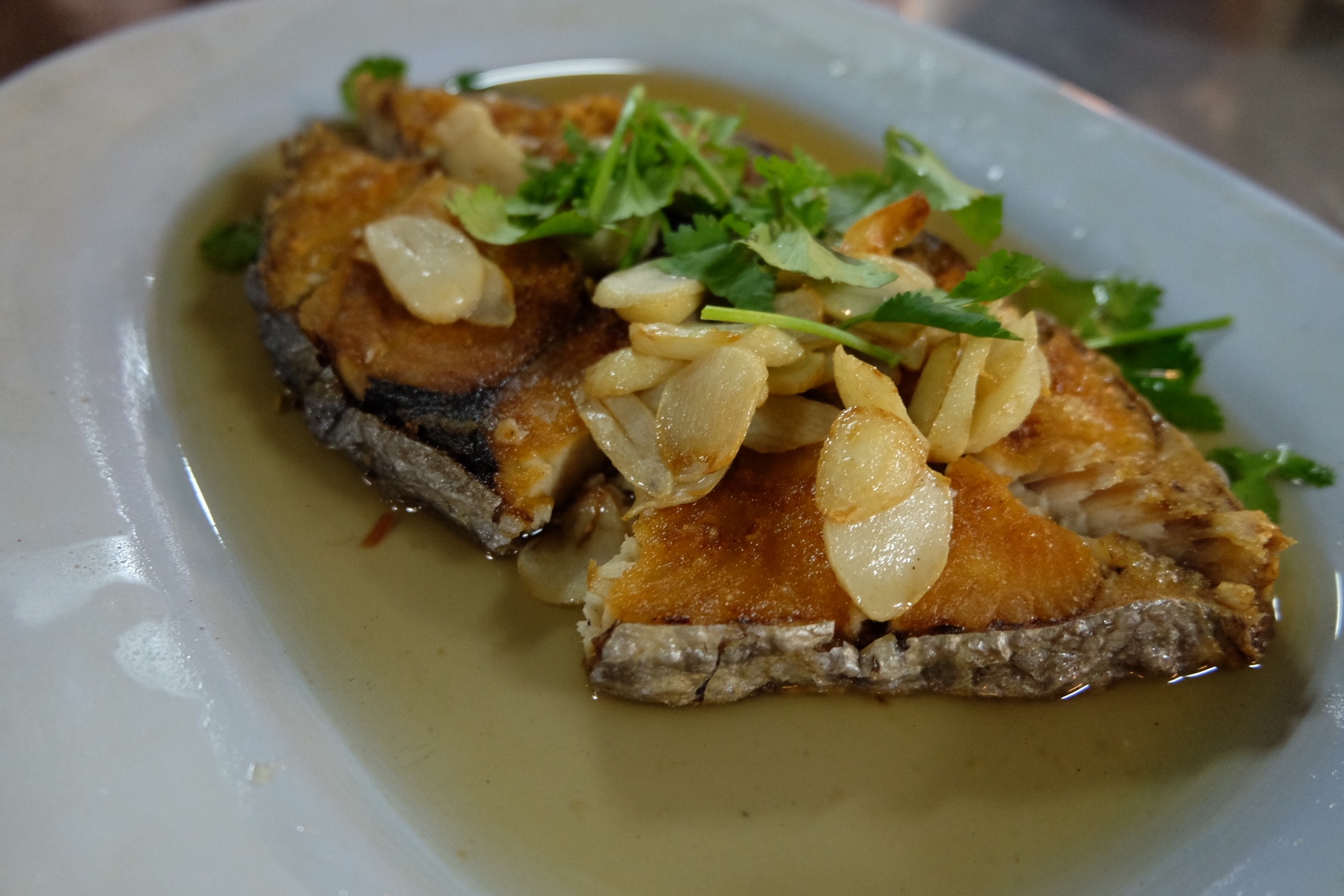 เมนูปลาอินทรีย์ทอดน้ำปลา ปลาอินทรีย์ทอดมารสชาติไม่โดดเด่นอะไรเนื้อแน่นๆตามปกติ แต่ที่อร่อยคือกระเทียมข้างบน อร่อยมาก!! ตักกระเทียมมาราดข้าวตามด้วยน้ำปลาที่ใช้ราดปลามานี่สุดยอดดดดดด