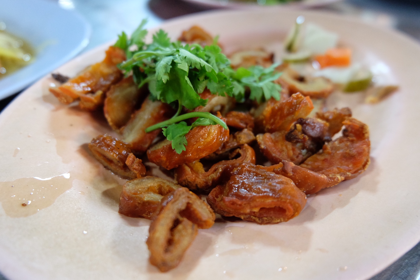 ทีเด็ดเลยสำหรับจานนี้ ลำไส้ใหญ่ทอด เสริฟคู่กับแตงกวาและแครอทดอง จานนี้กินได้เรื่อยๆฮะ อร่อยกรอบนอกนุ่มใน กินกับผักดองเครื่องเคียงพร้อมจิ้มน้ำจิ้มซีอิ๊วรสเปรี้ยวหวาน กินเพลินๆเลยฮะ